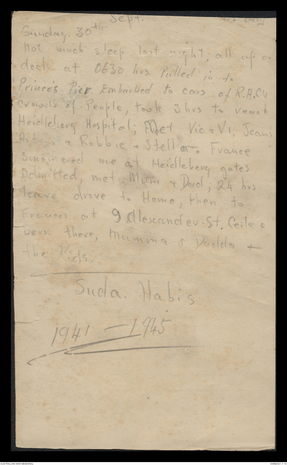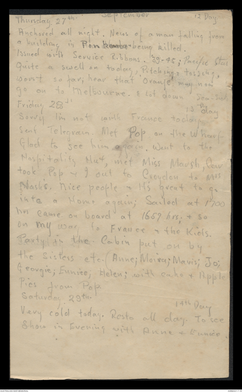 Sent Telegram. Met Pop on the Wharf