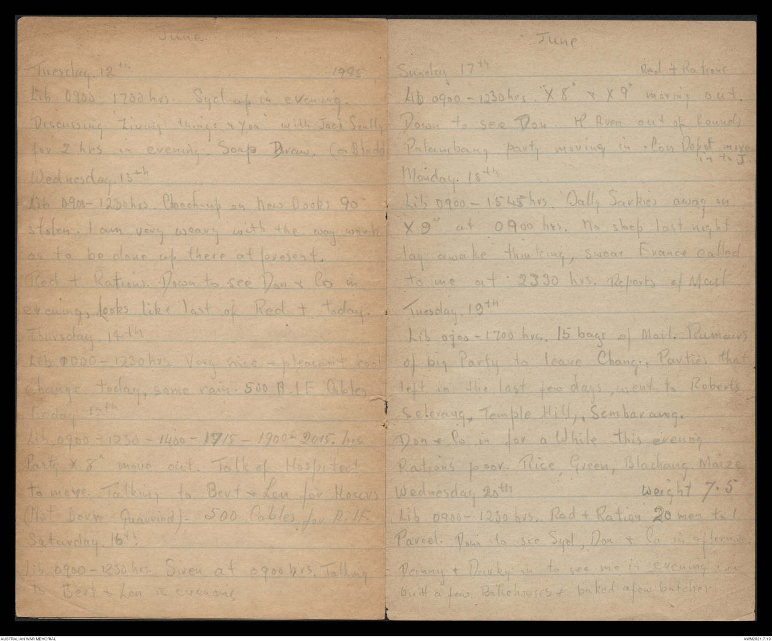 Lib 0900 - 1230 hrs. Red & Ration 20 men to 1