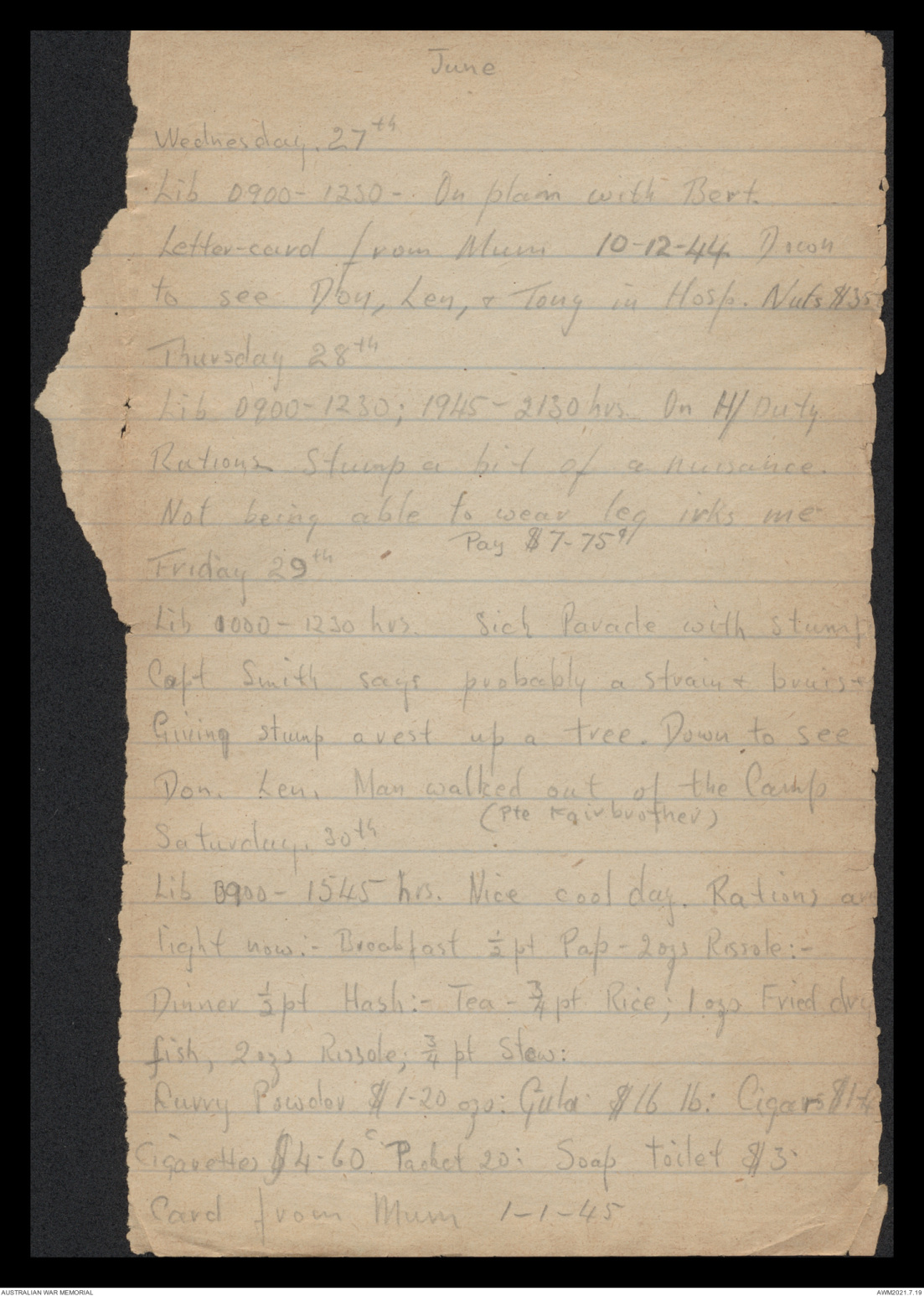 Lunch :- ½ pt Hash. Tea :- ½ pt P. Rice ½ pt Stew