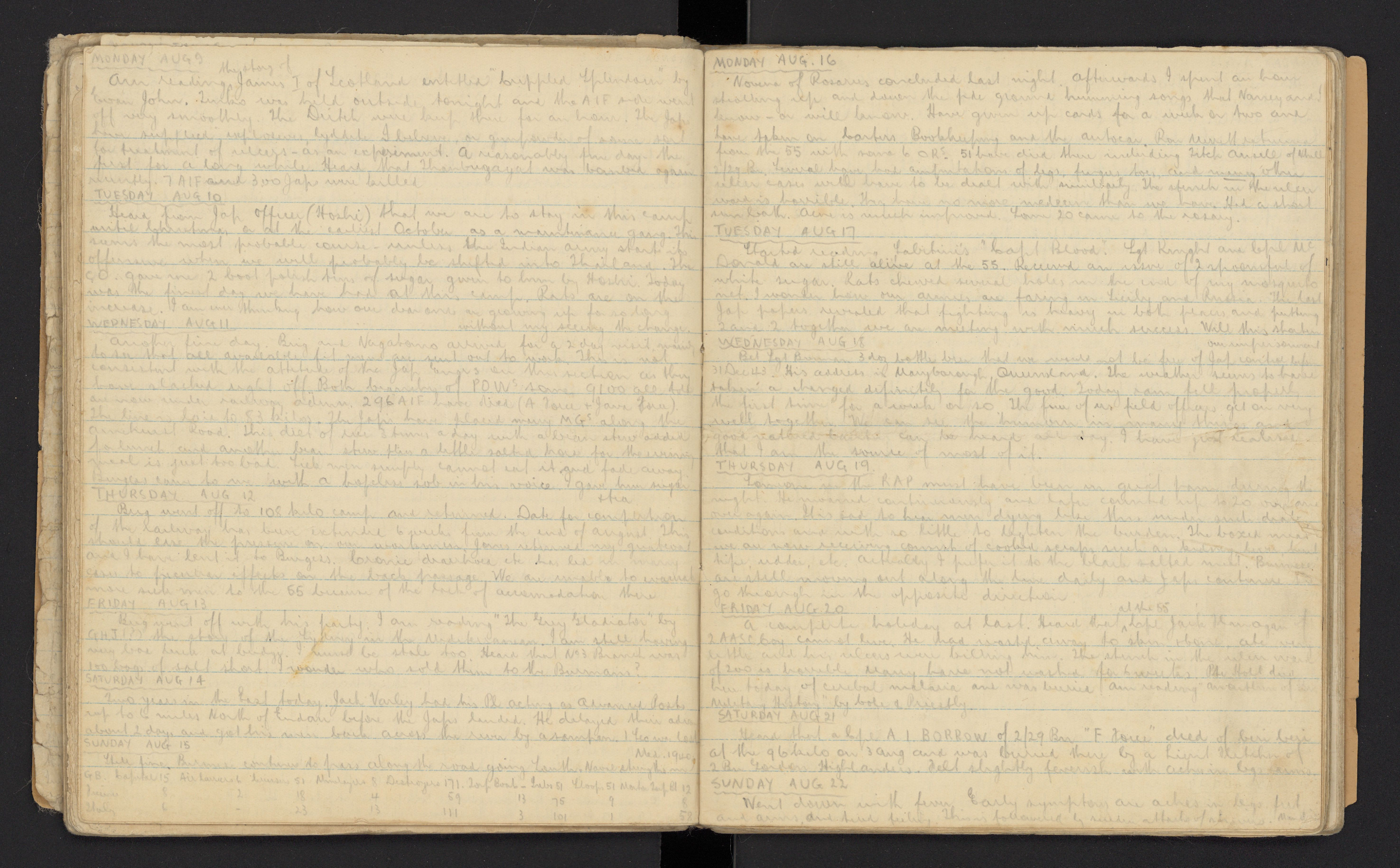 SUNDAY JUL 22. Mass & HC. Planes at night again. 200 officers left for the other camp. Felt dreadful all day. I get these periodical attacks - and dread their re-occurrence.