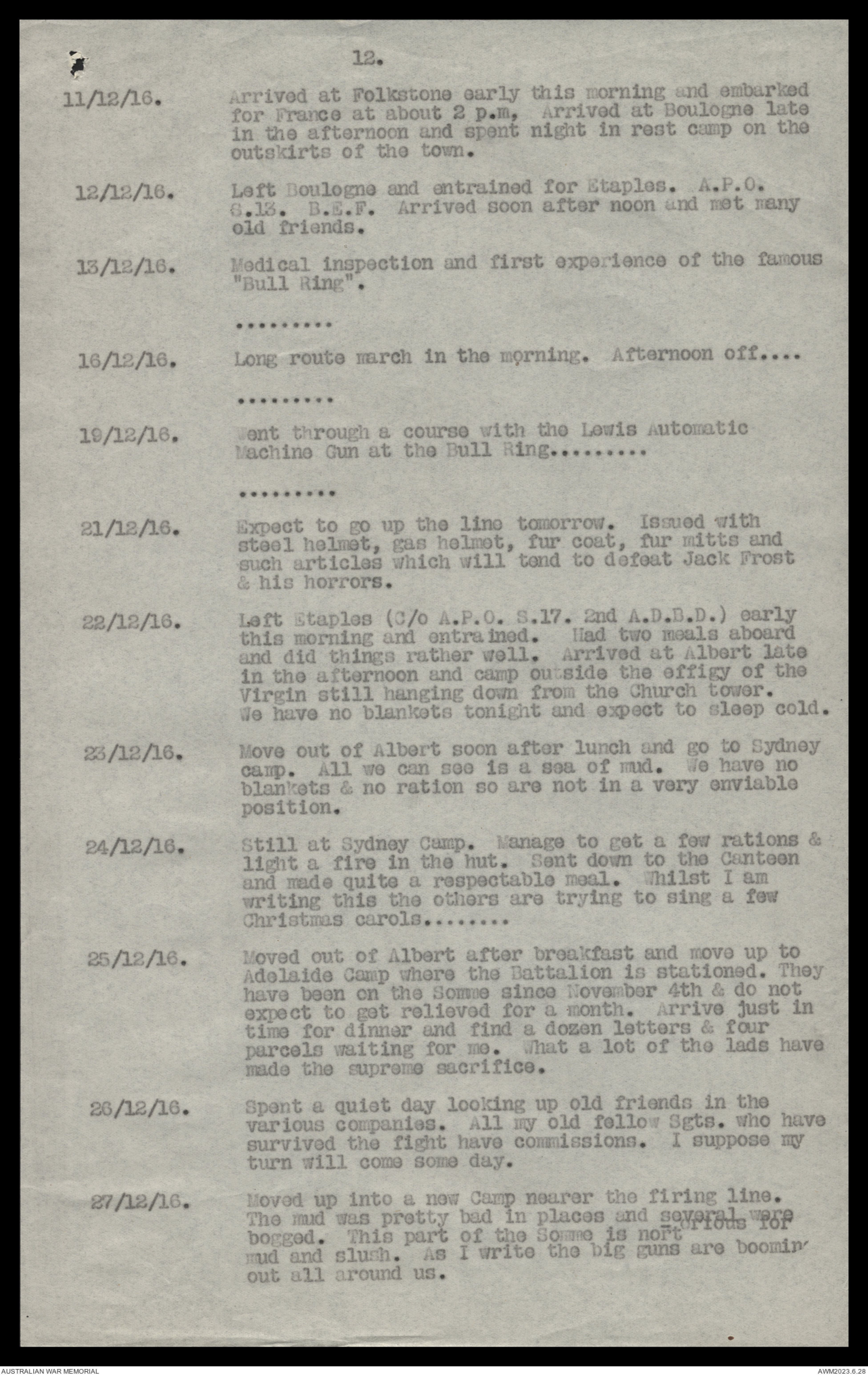 12/12/16. Left Boulogne and entrained for Etaples. A.P.O.