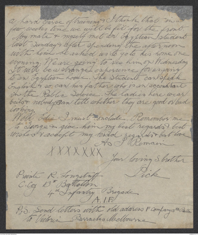 P.S. Send letters with old address F. Company 13th Battn