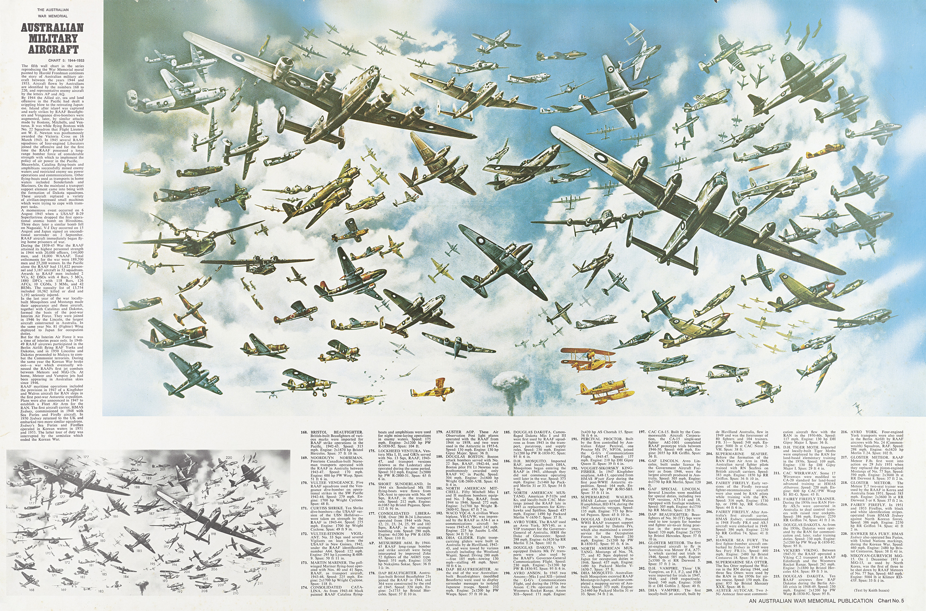 The fifth wall chart in the series reproducing the War Memorial mural painted by Harold Freedman continues the story of Australian military aircraft between the years 1944 and 1953. Aircraft flown by Australians are identified by the numbers 168 to 220, and representative enemy aircraft by the letters AP and AQ.
