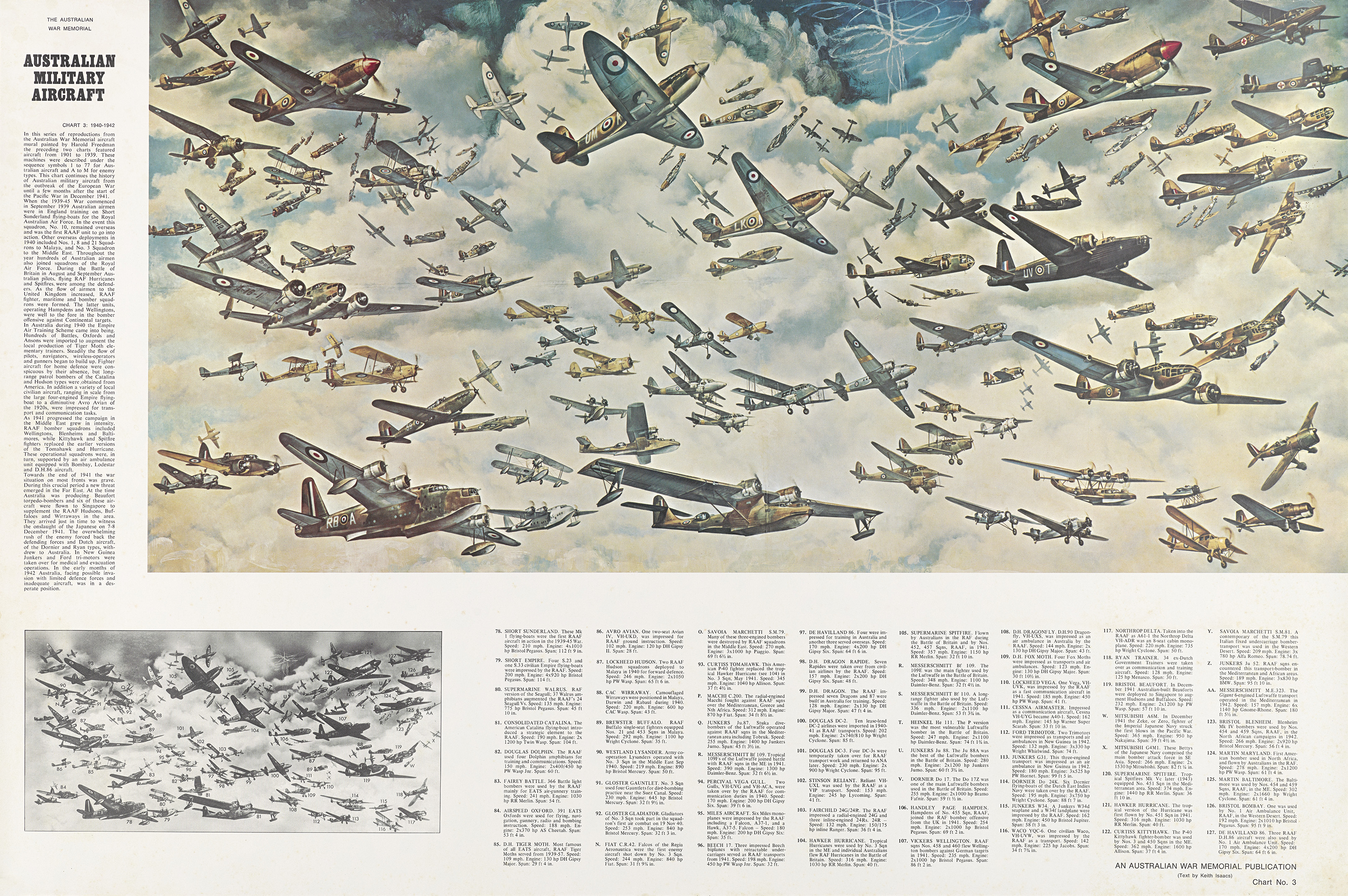 In this series of reproductions from the Australian War Memorial aircraft mural painted by Harold Freedman the preceding two charts featured aircraft from 1901 to 1939. These machines were described under the sequence symbols 1 to 77 for Australian aircraft and A to M for enemy types. This chart continues the history of Australian military aircraft from the outbreak of the European War until a few months after the start of the Pacific War in December 1941.