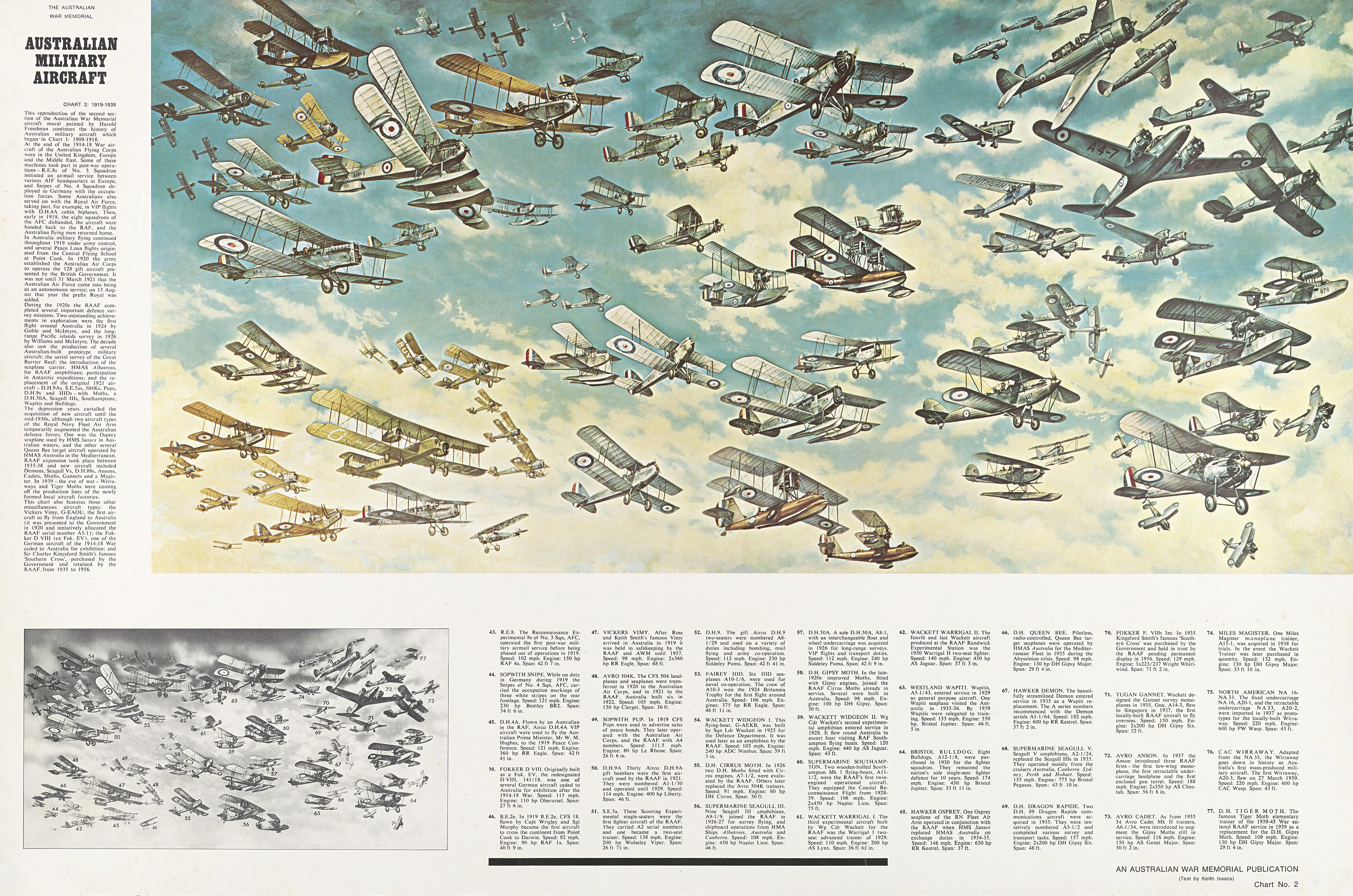 This reproduction of the second section of the Australian War Memorial aircraft mural painted by Harold Freedman continues the history of Australian military aircraft which began in Chart 1: 1909-1918.