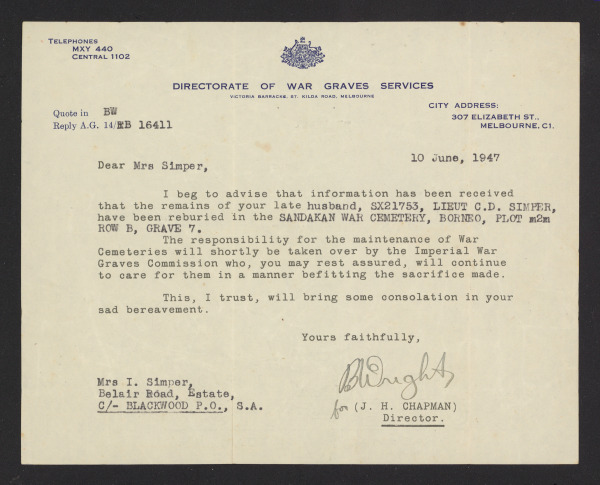 that the remains of your late husband, SX21753, LIEUT C.D. SIMPER,