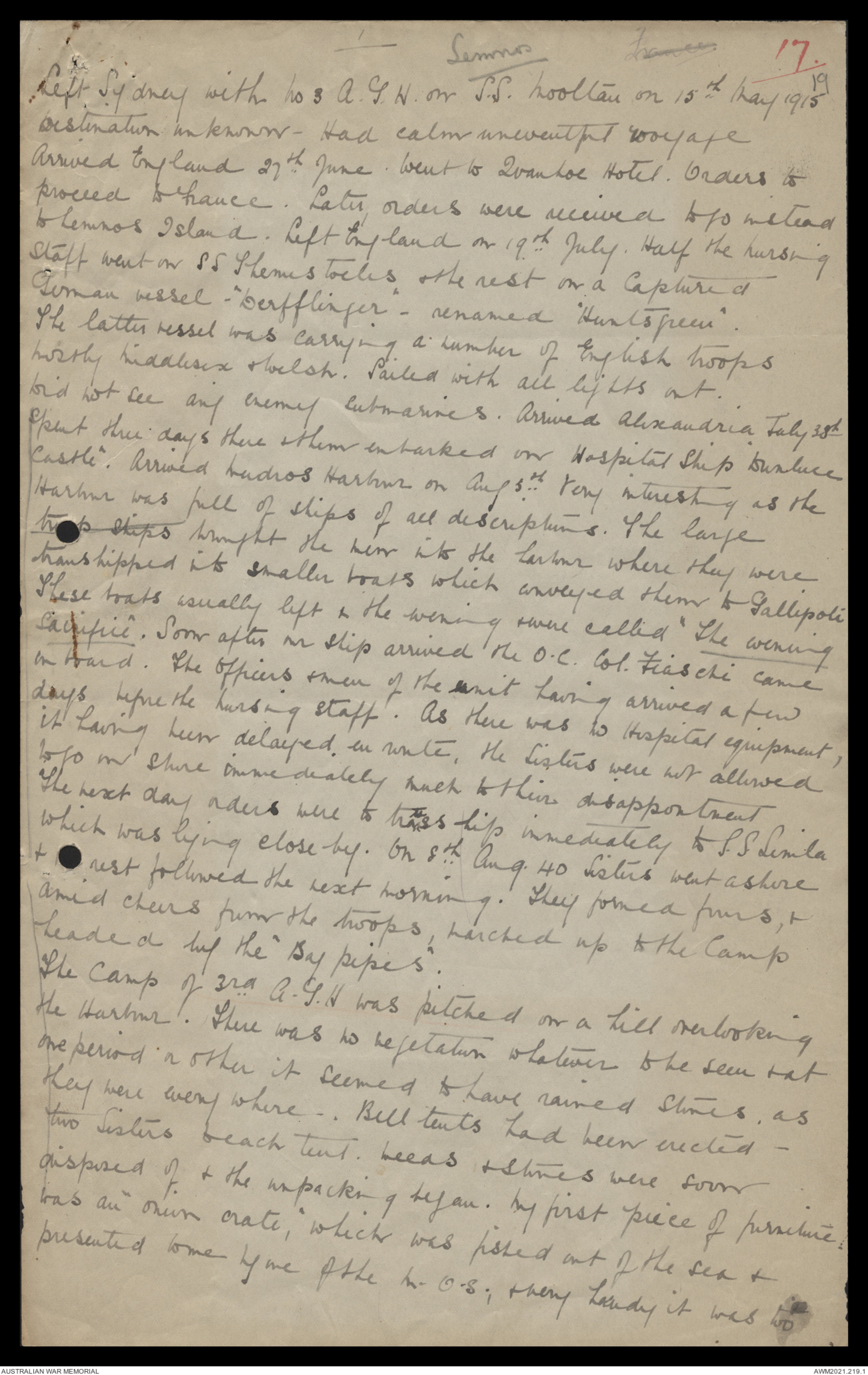 to Lemnos Island. Left England on 19th July. Half the Nursing