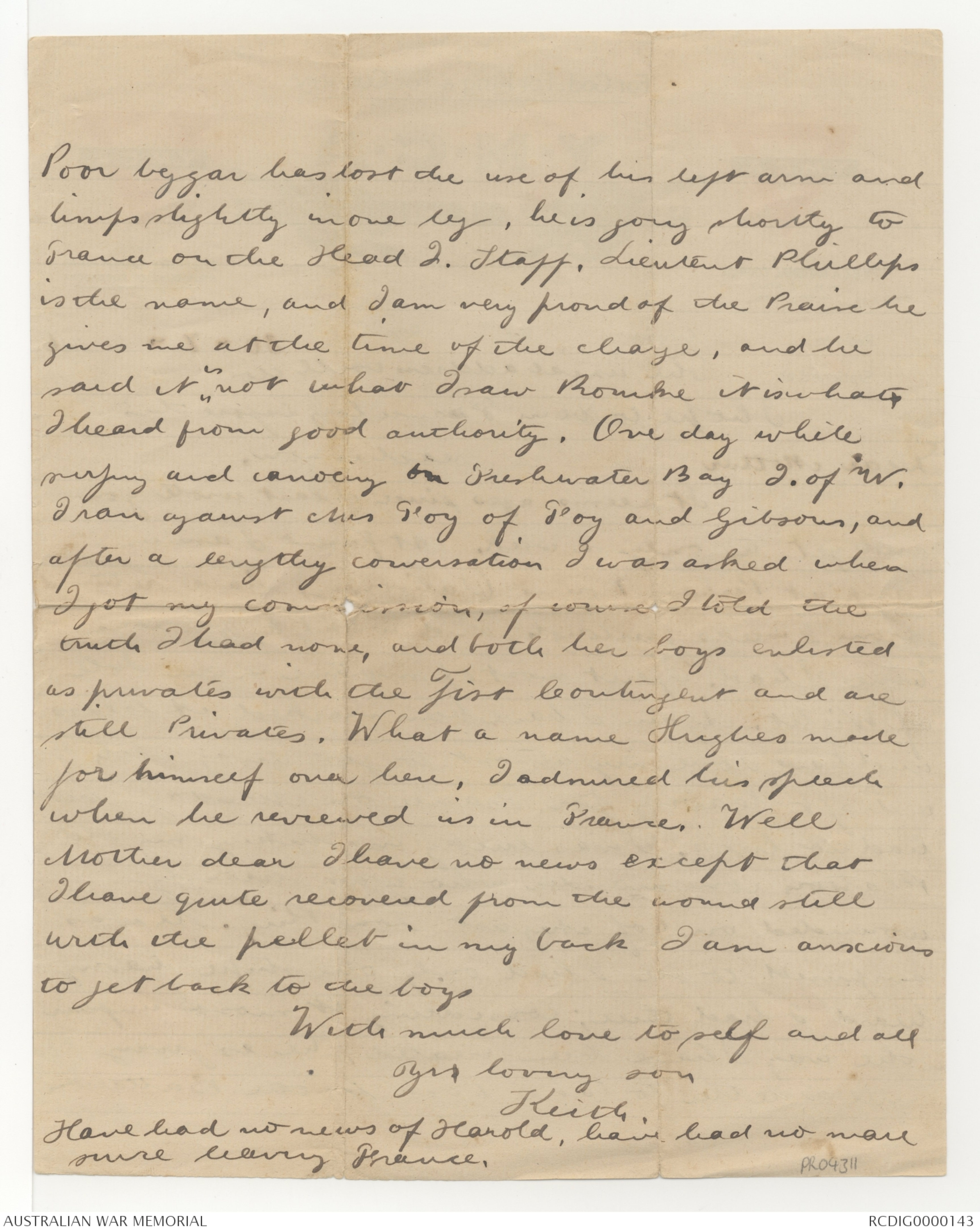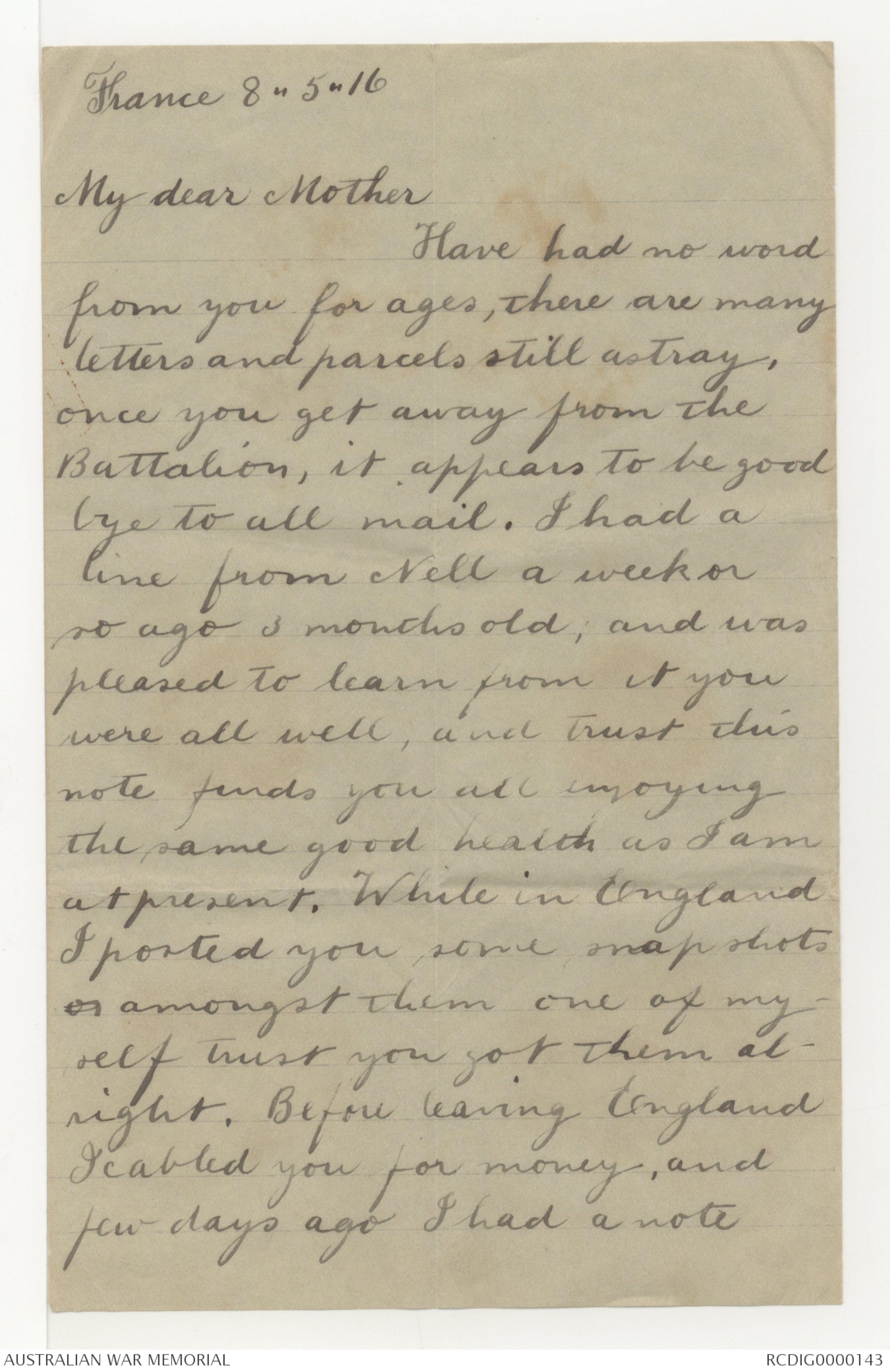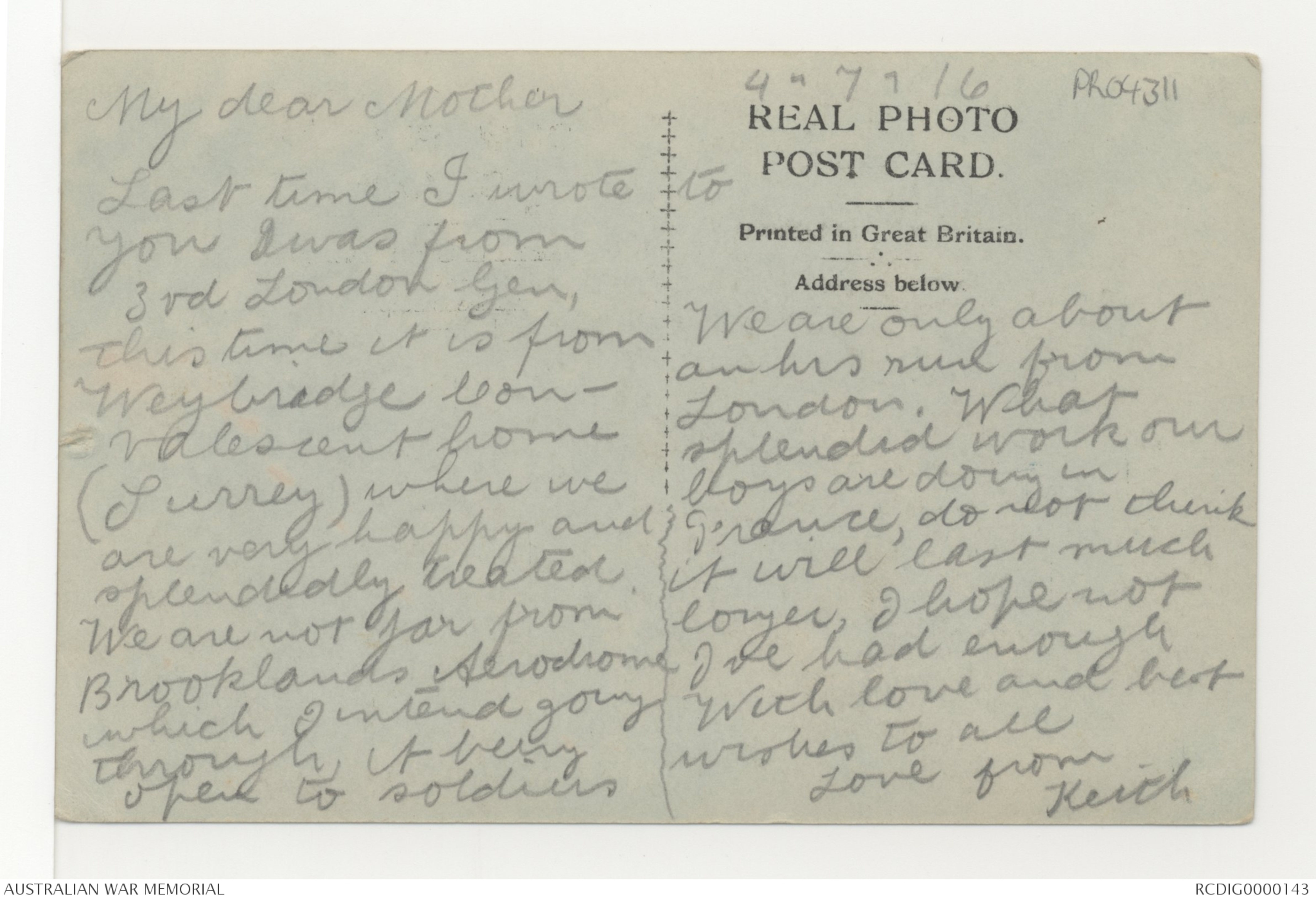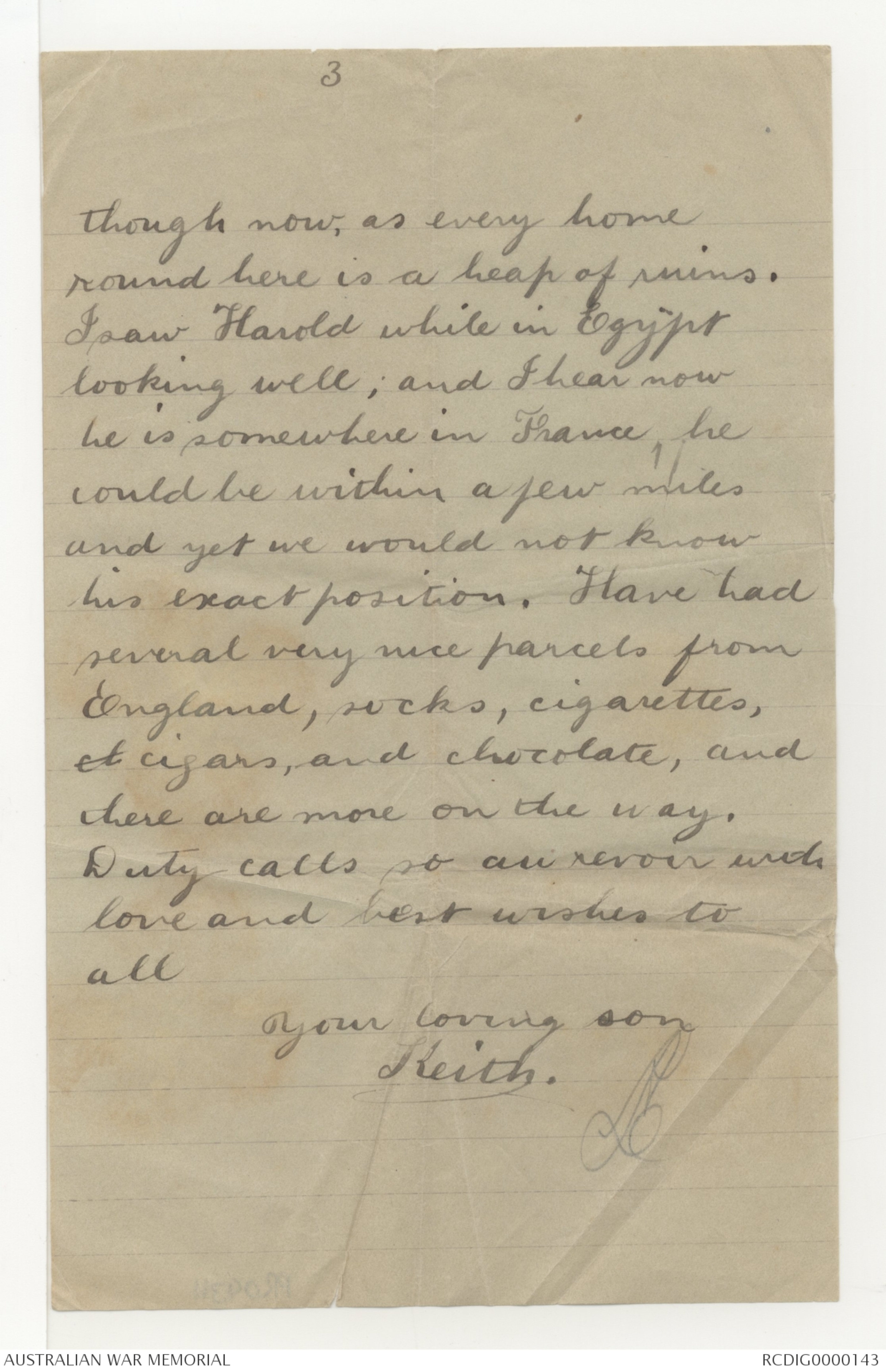 Letters from Keith Rourke to his mother, and related correspondence to Mrs Rourke, 1916 - Part 3