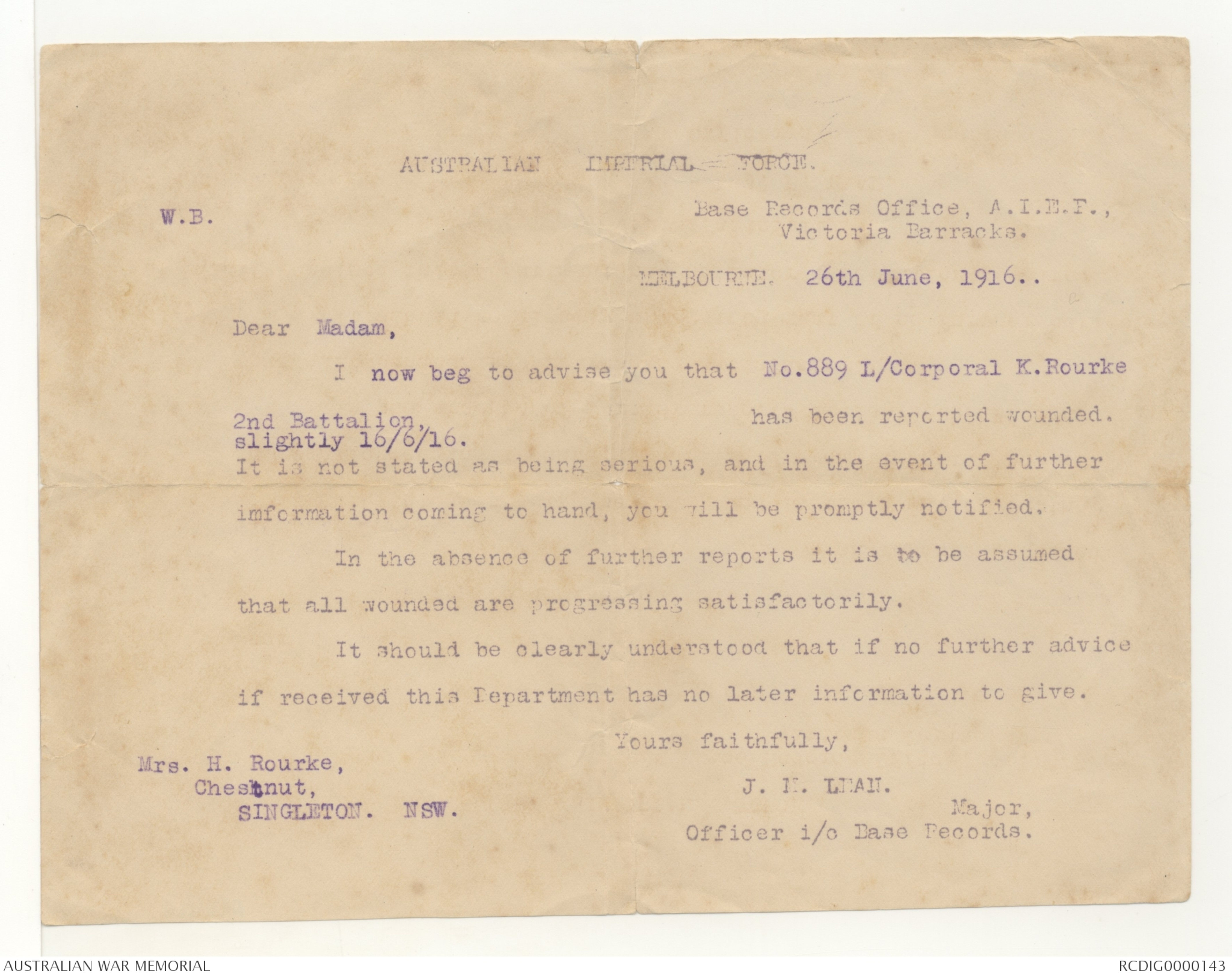 I now beg to advise you that No.889 L/Corporal K. Rourke