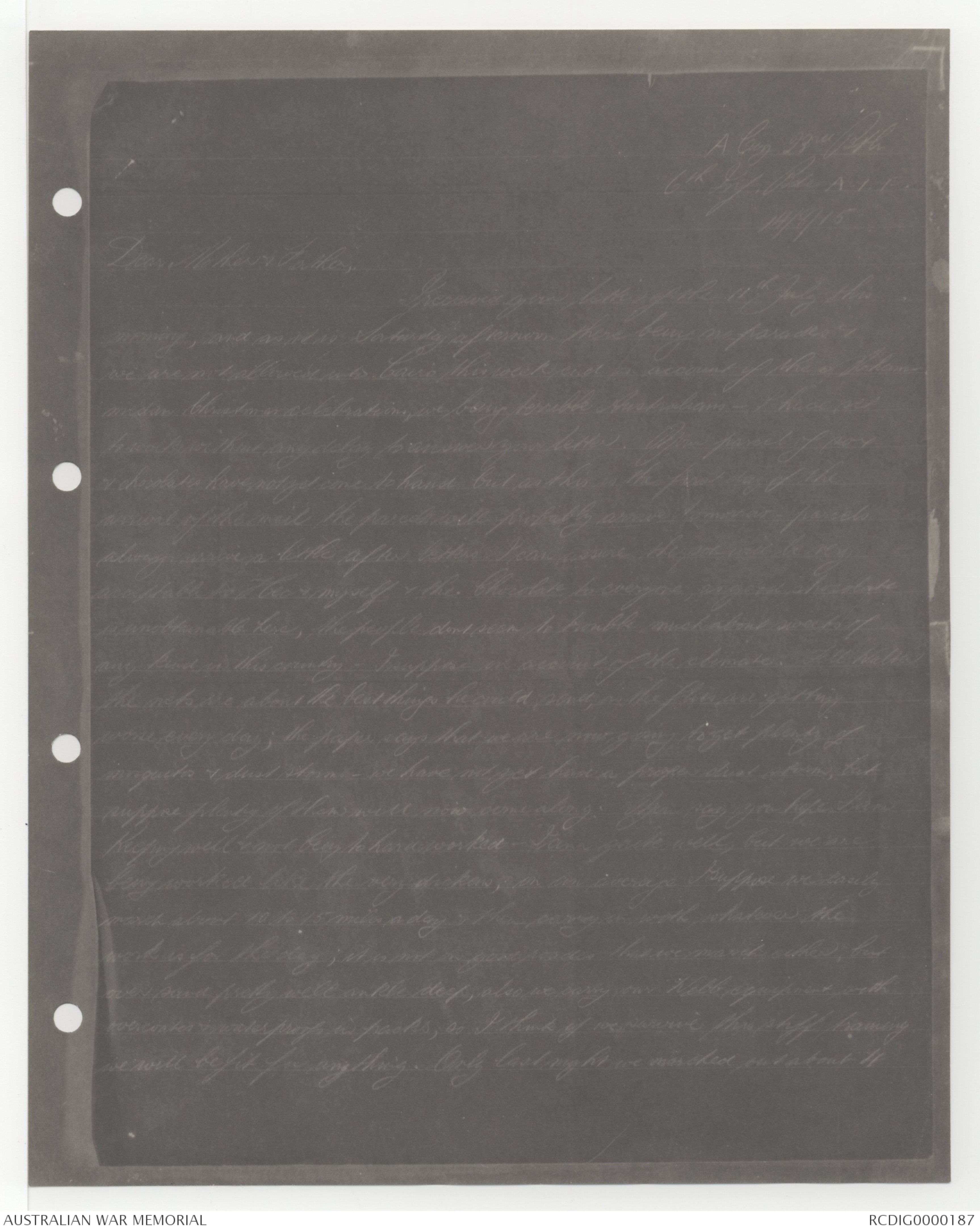 have great trouble here with the chap who caters for the meals. You cannot get any satsifaction out of the nigger; it cost us 4/2 per day & I'll swear we don't get 2/- worth out
