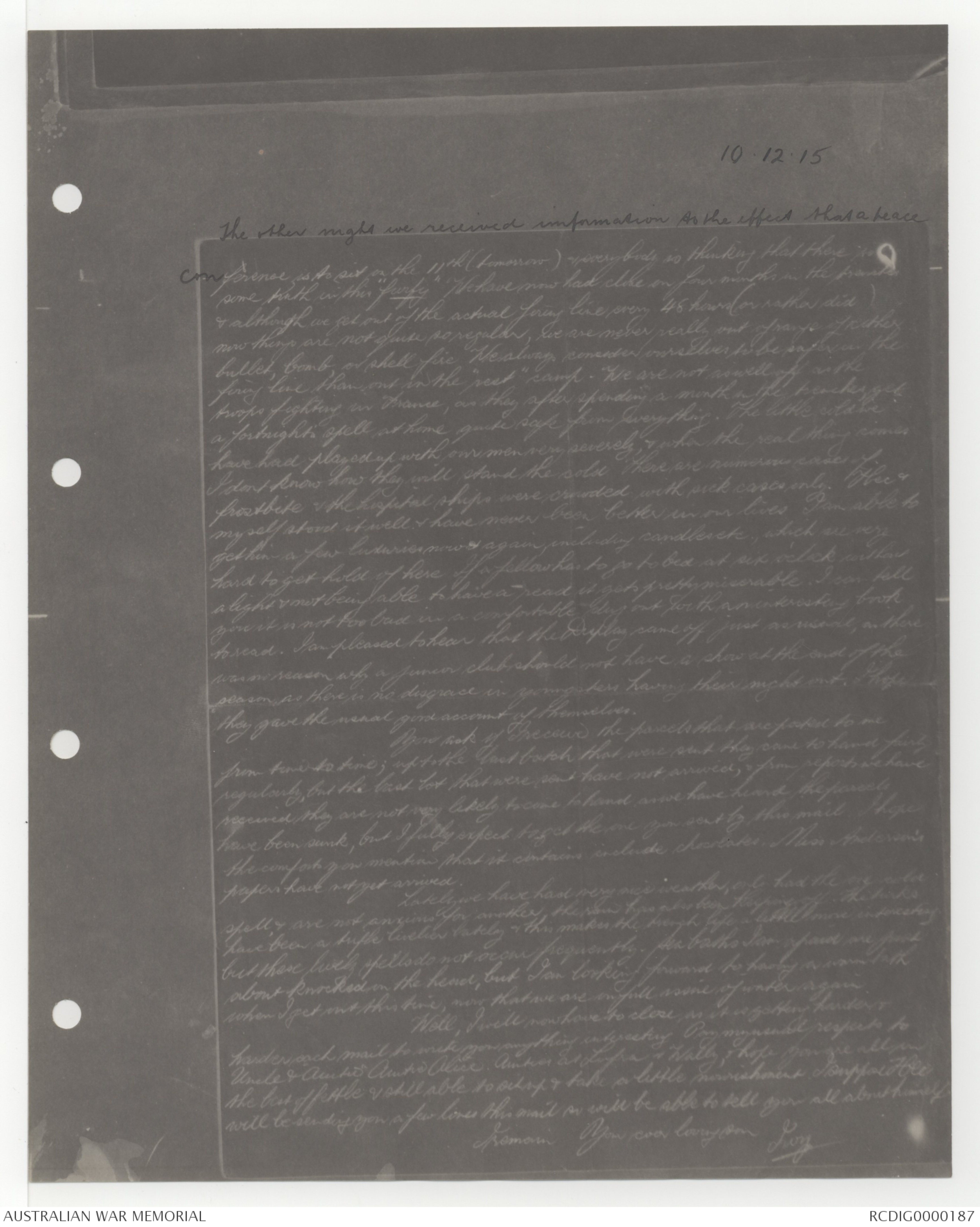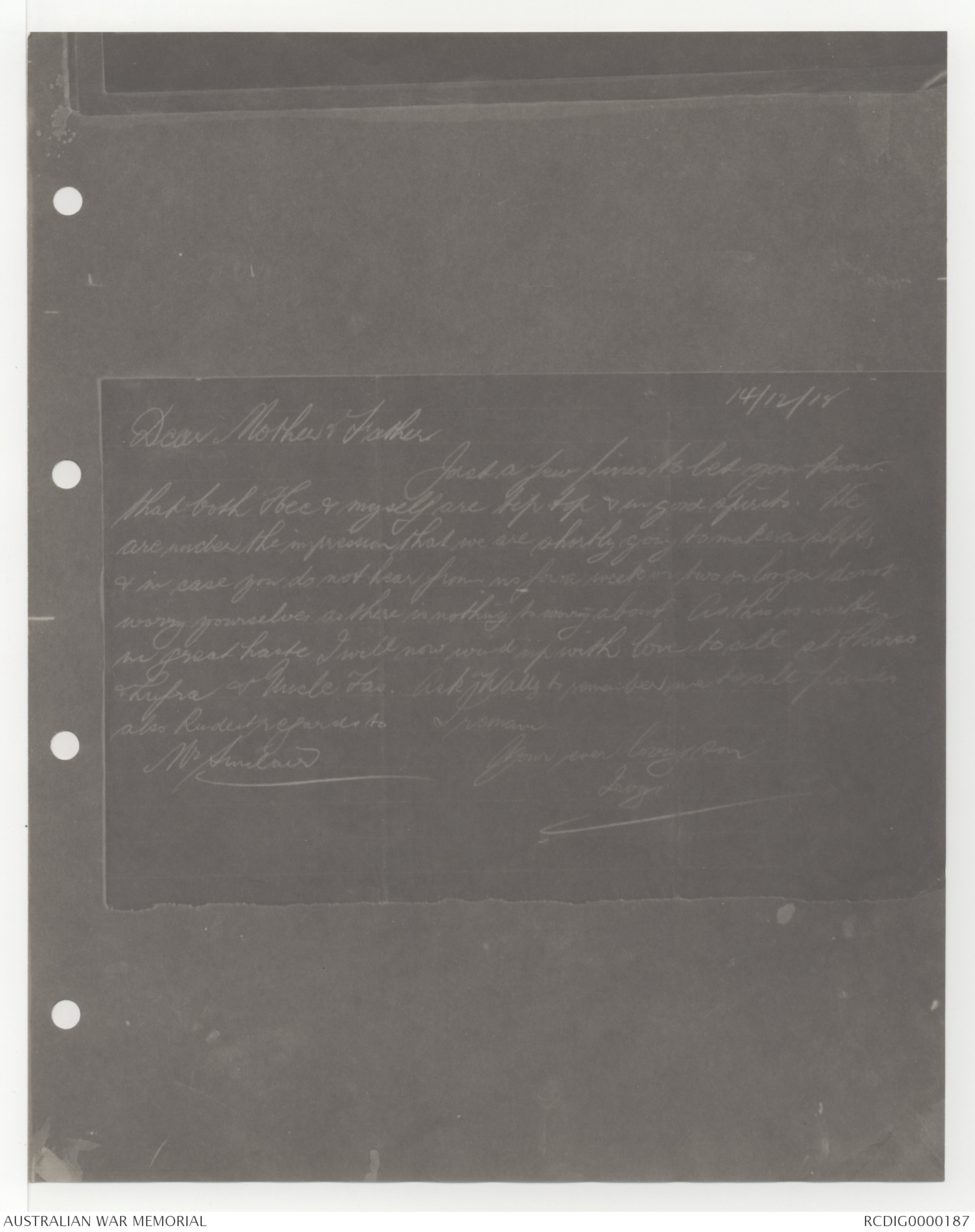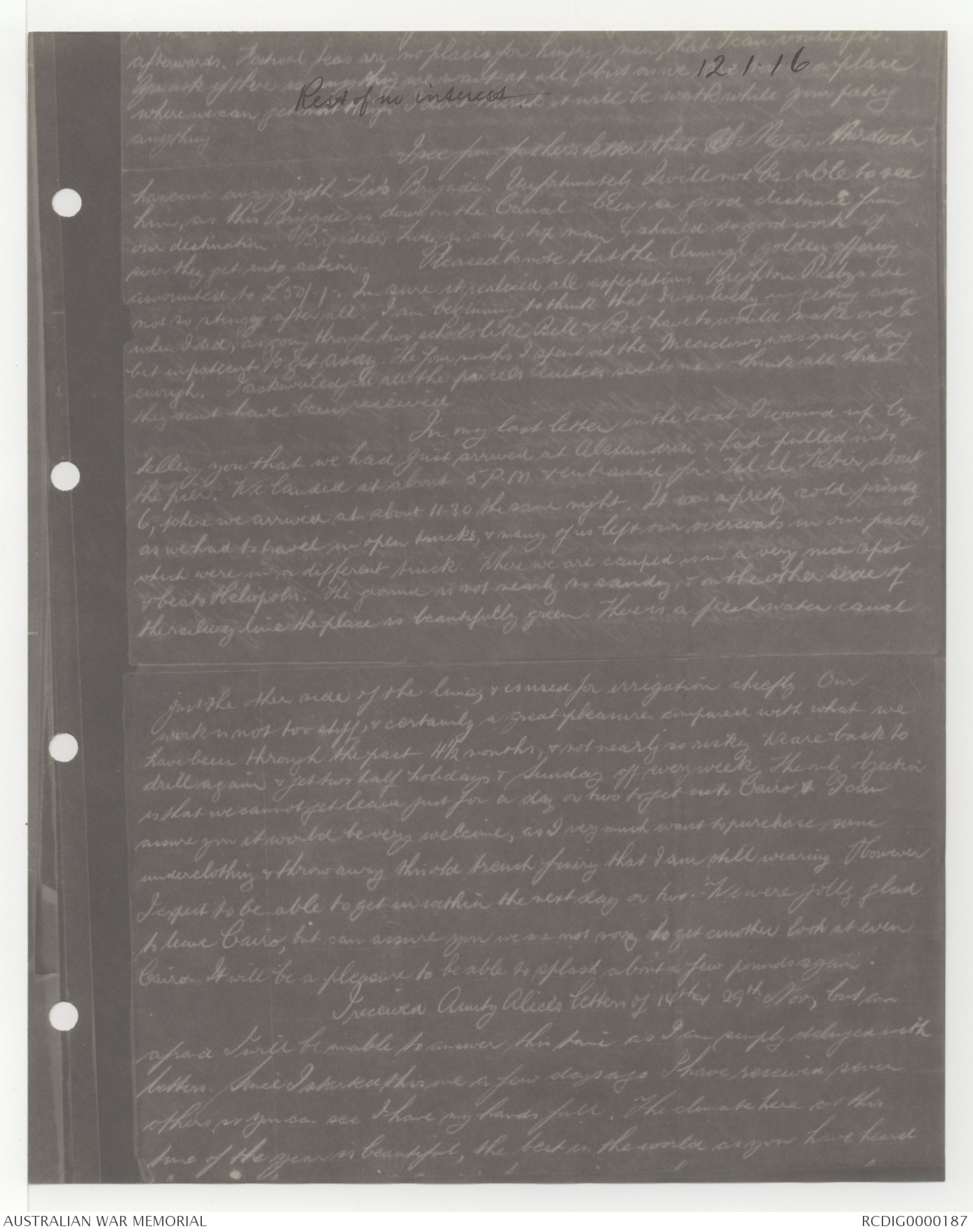 I received Aunty Alice's letters of 14th & 29th Nov, but am