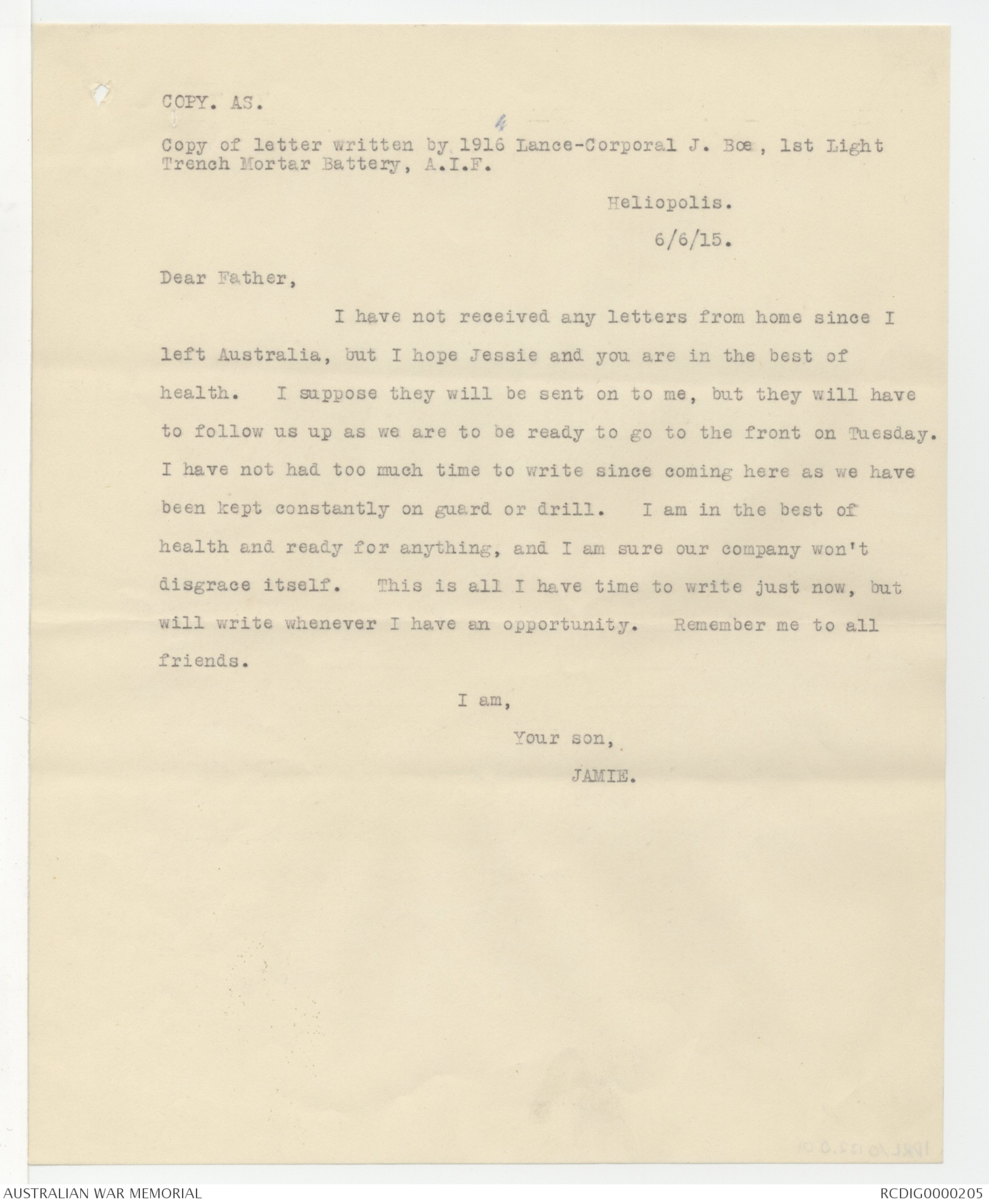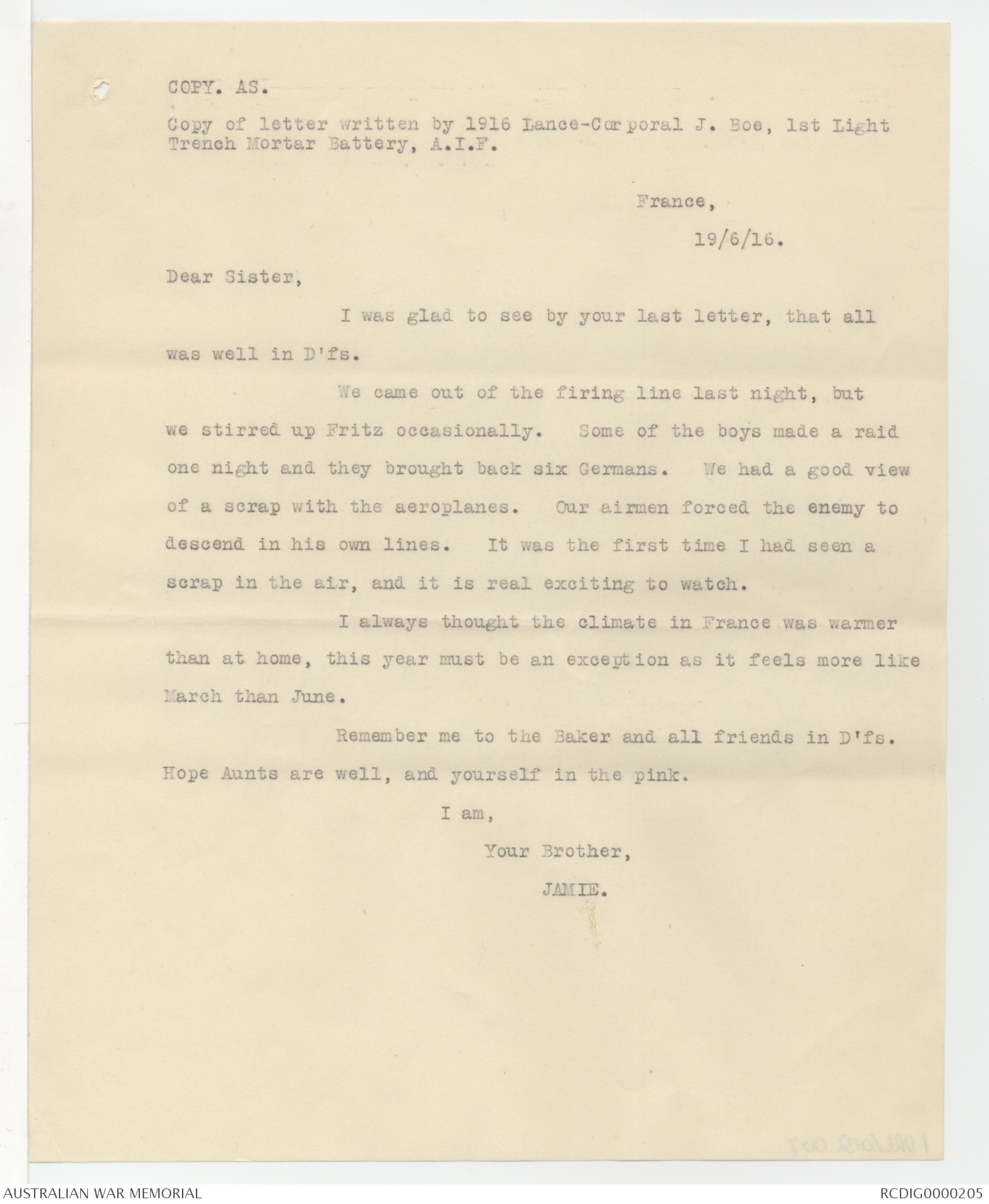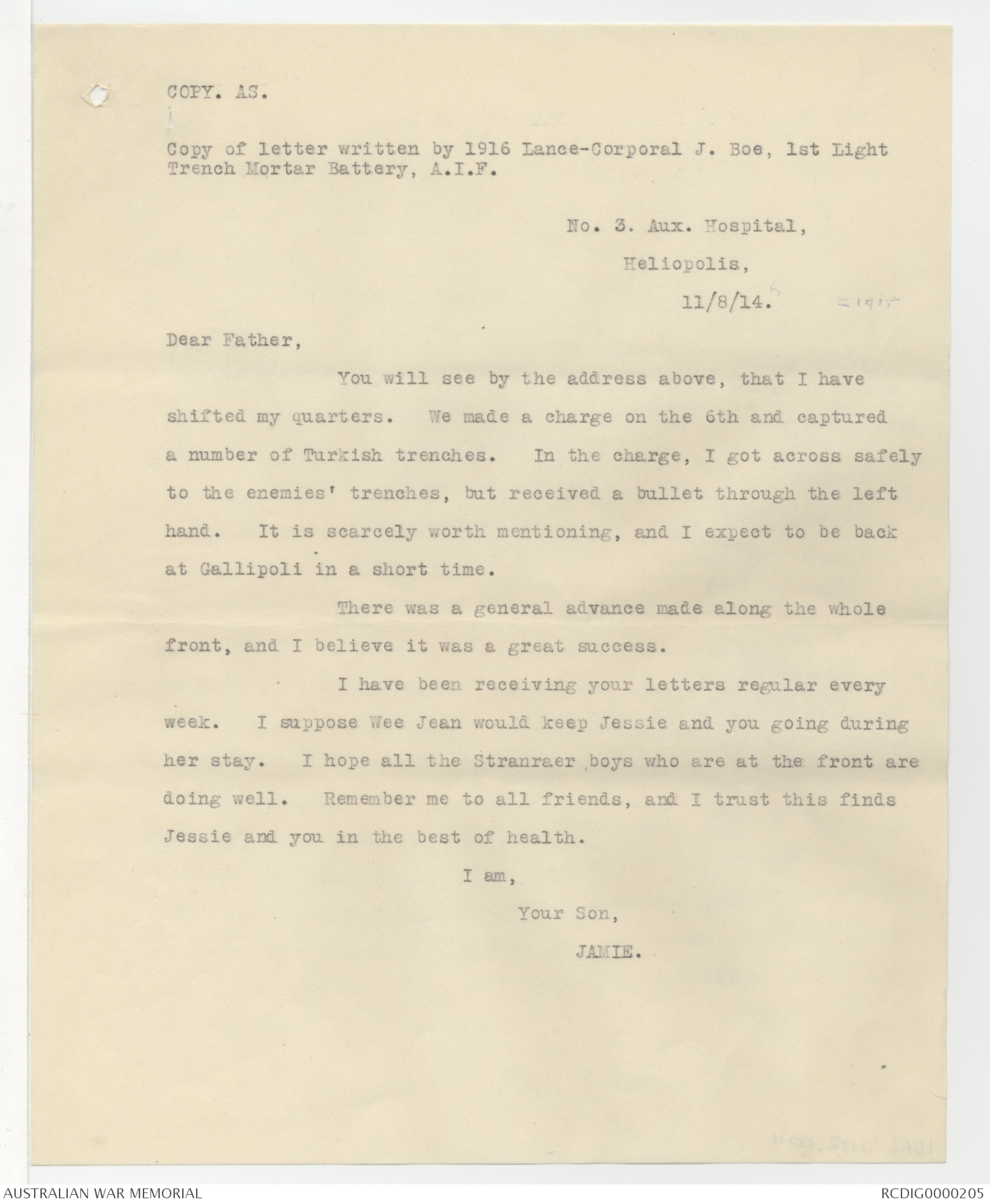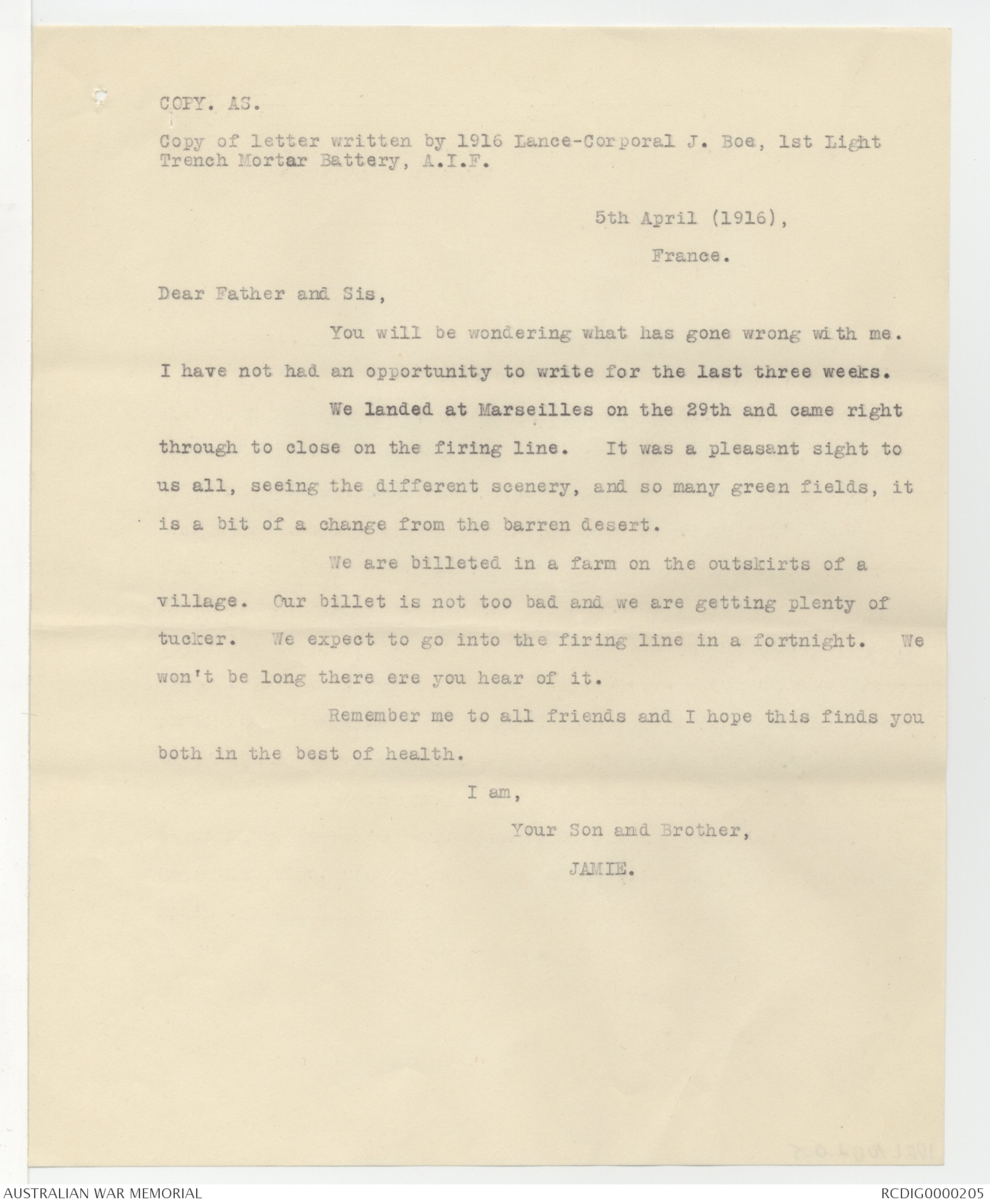 Copy of letter written by 1916 Lance-Corporal J. Boe, 1st Light