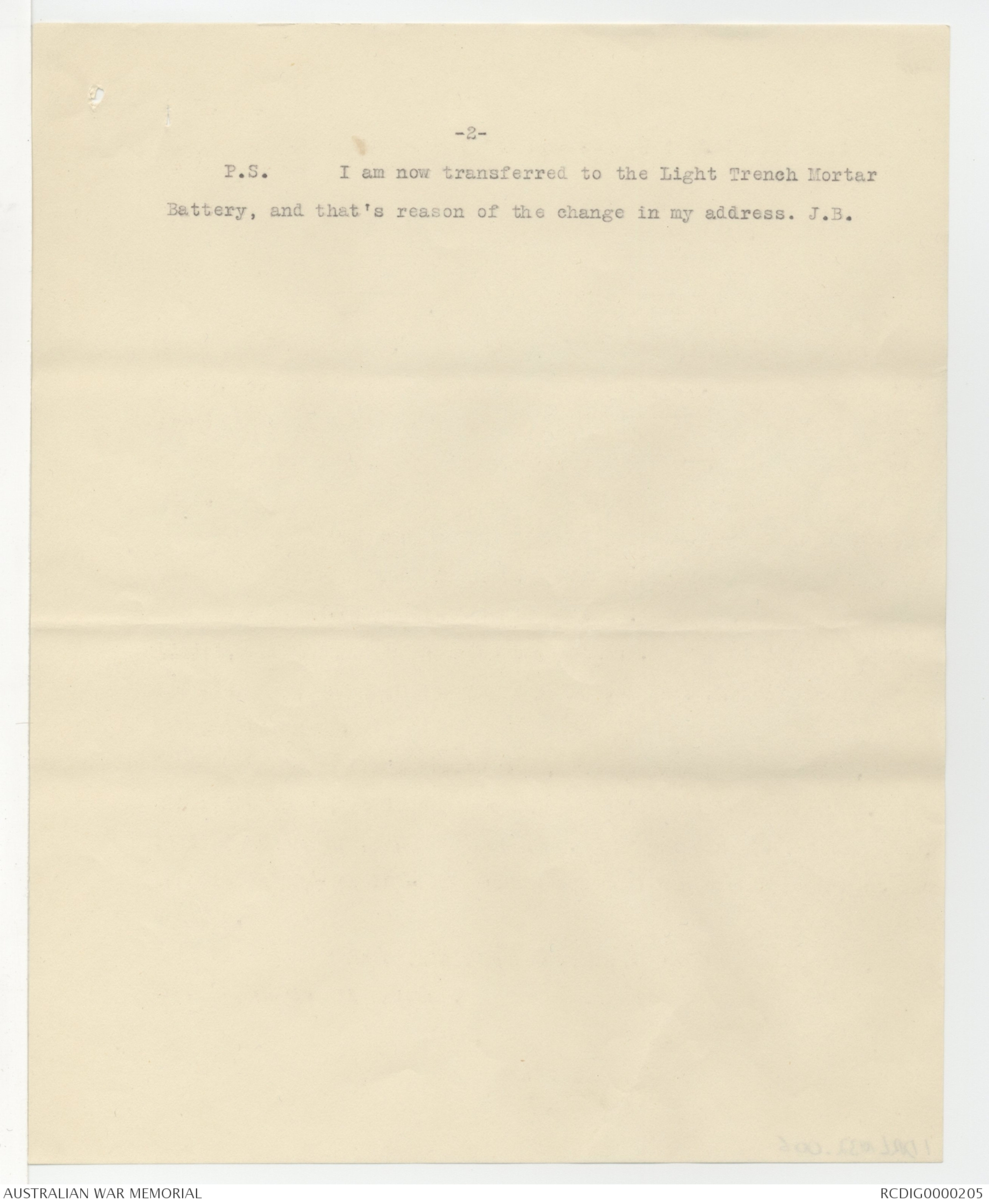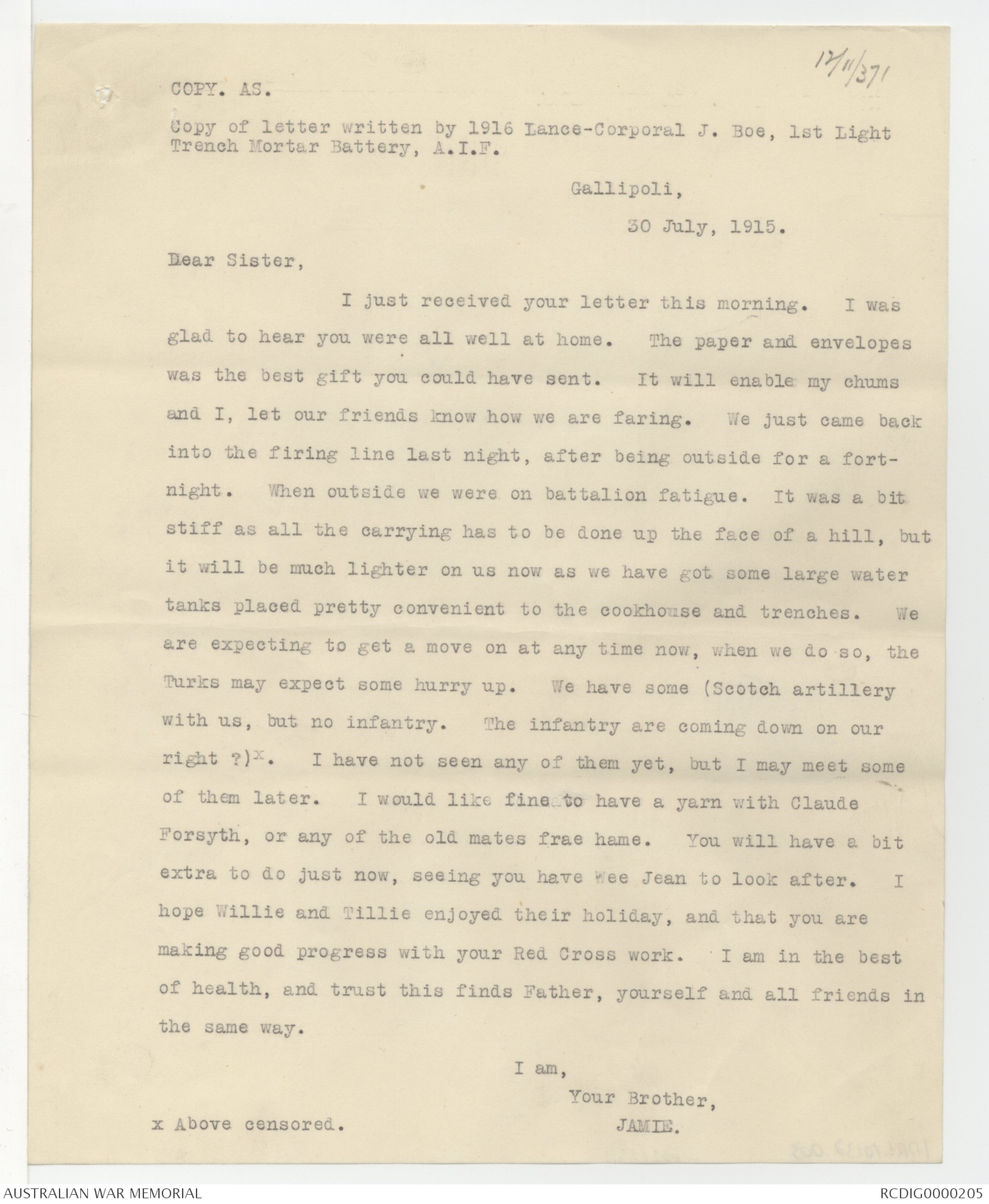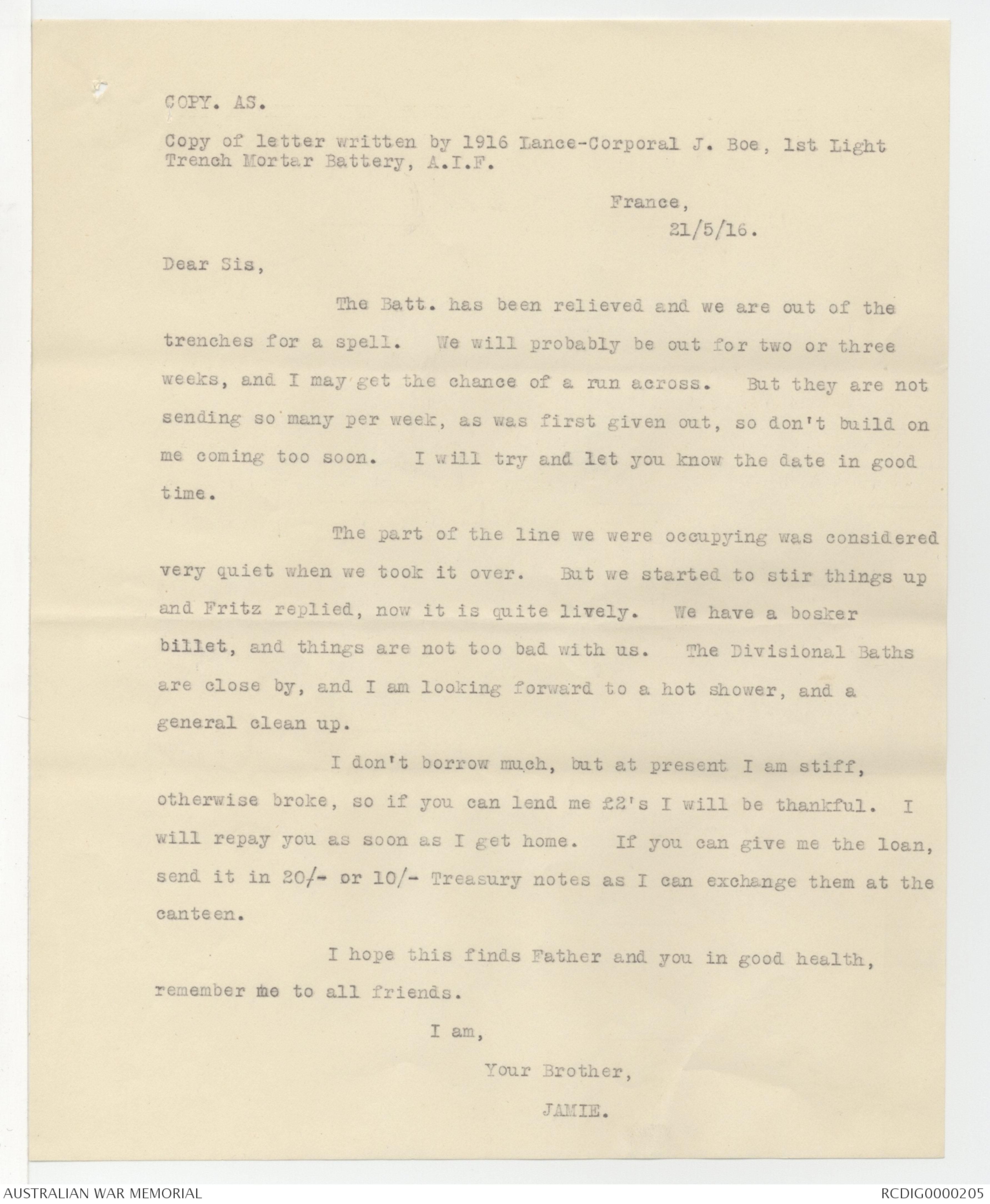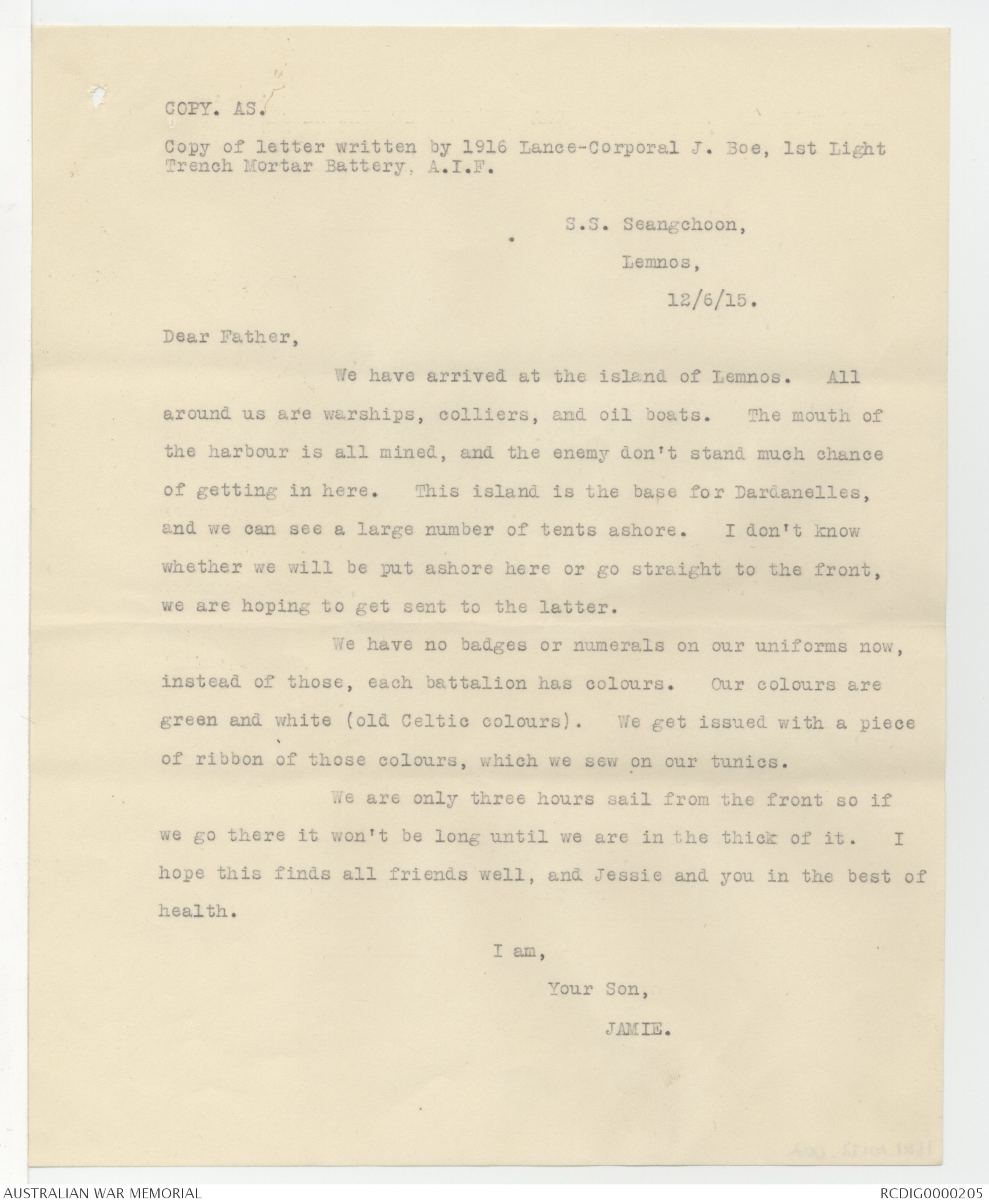 Copy of letter written by 1916 Lance-Corporal J. Boe, 1st Light