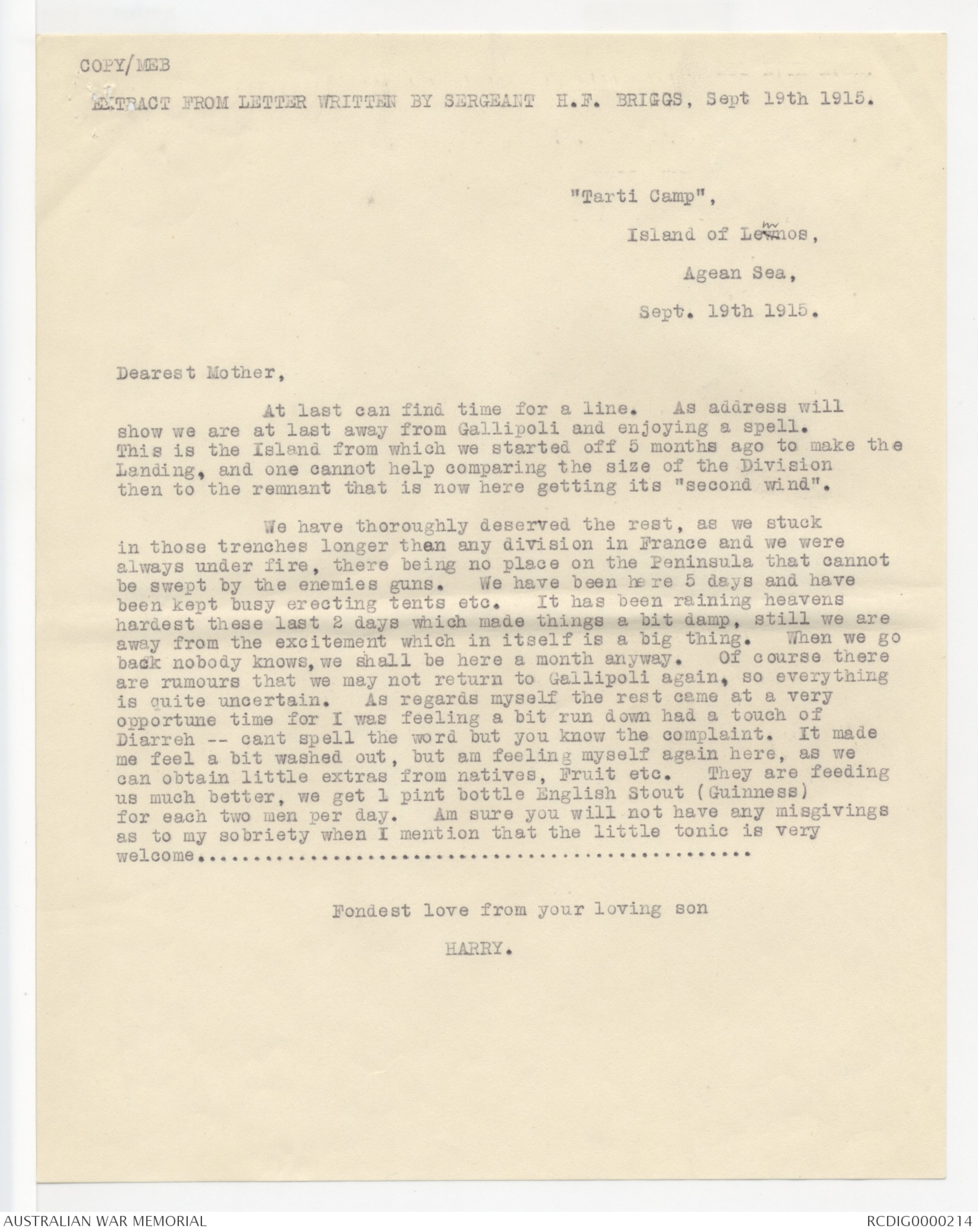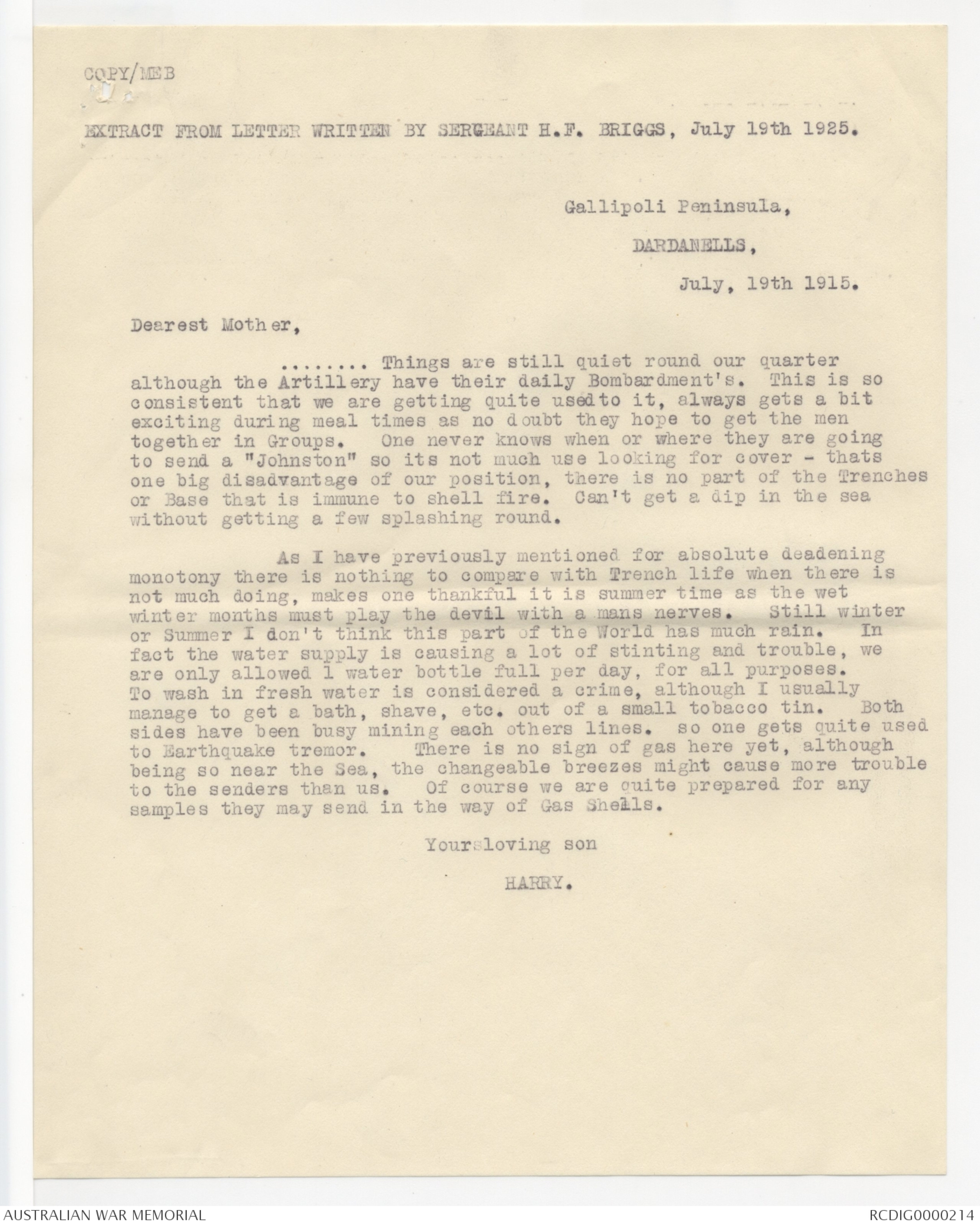 EXTRACT FROM LETTER WRITTEN BY SERGEANT H.F. BRIGGS, JULY 19TH 1915.