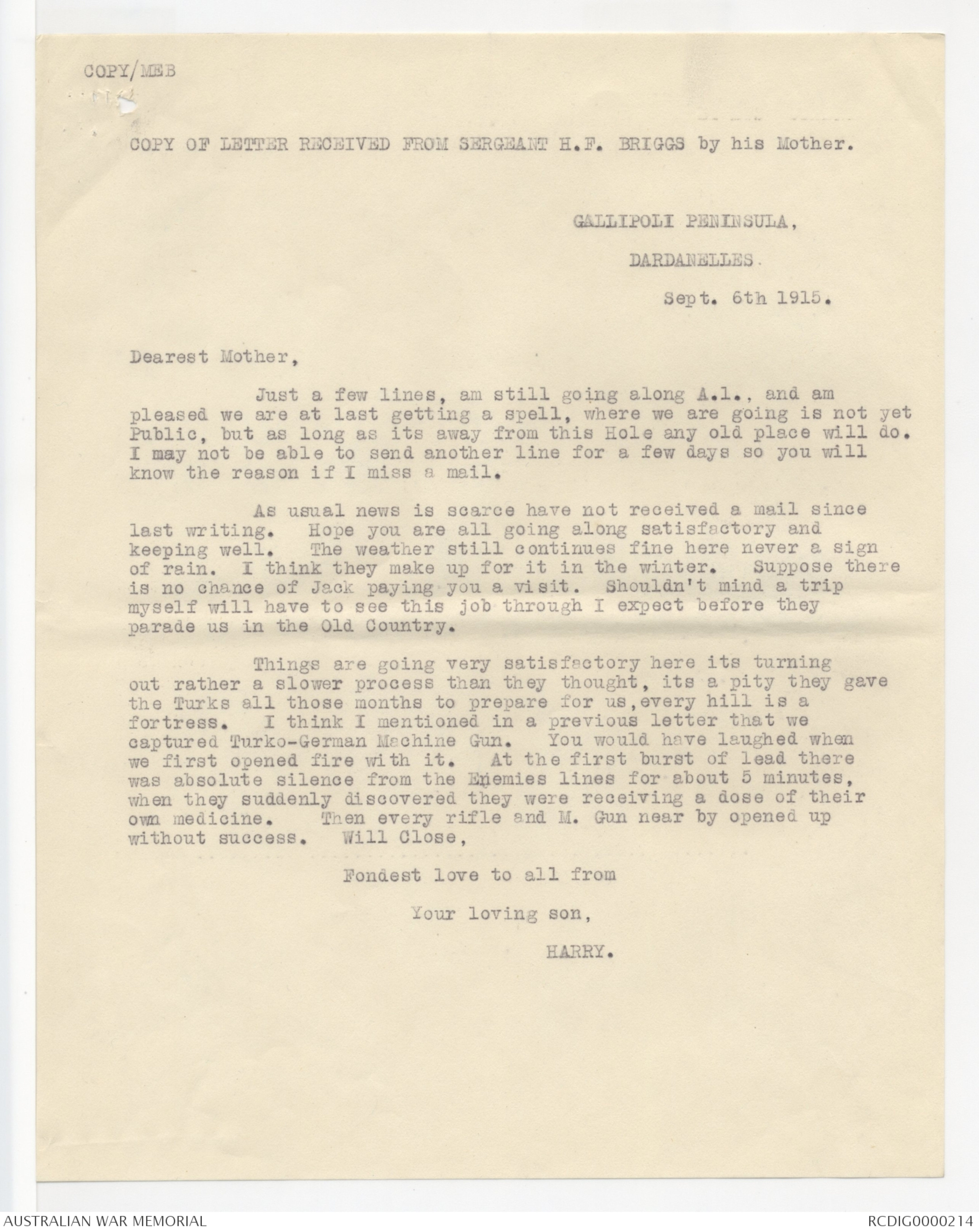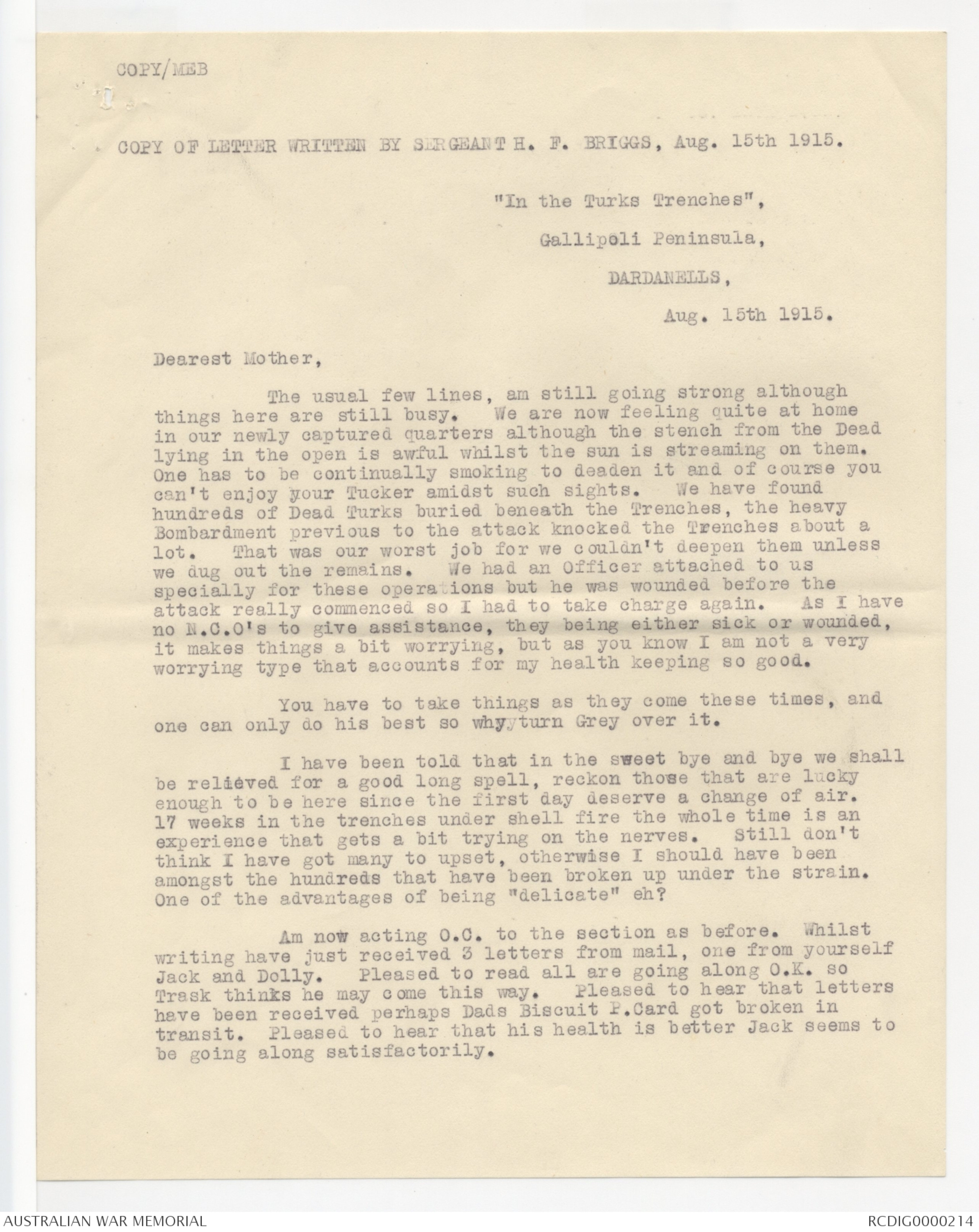 COPY OF LETTER WRITTEN BY SERGEANT H.F. BRIGGS, AUG. 15TH 1915.
