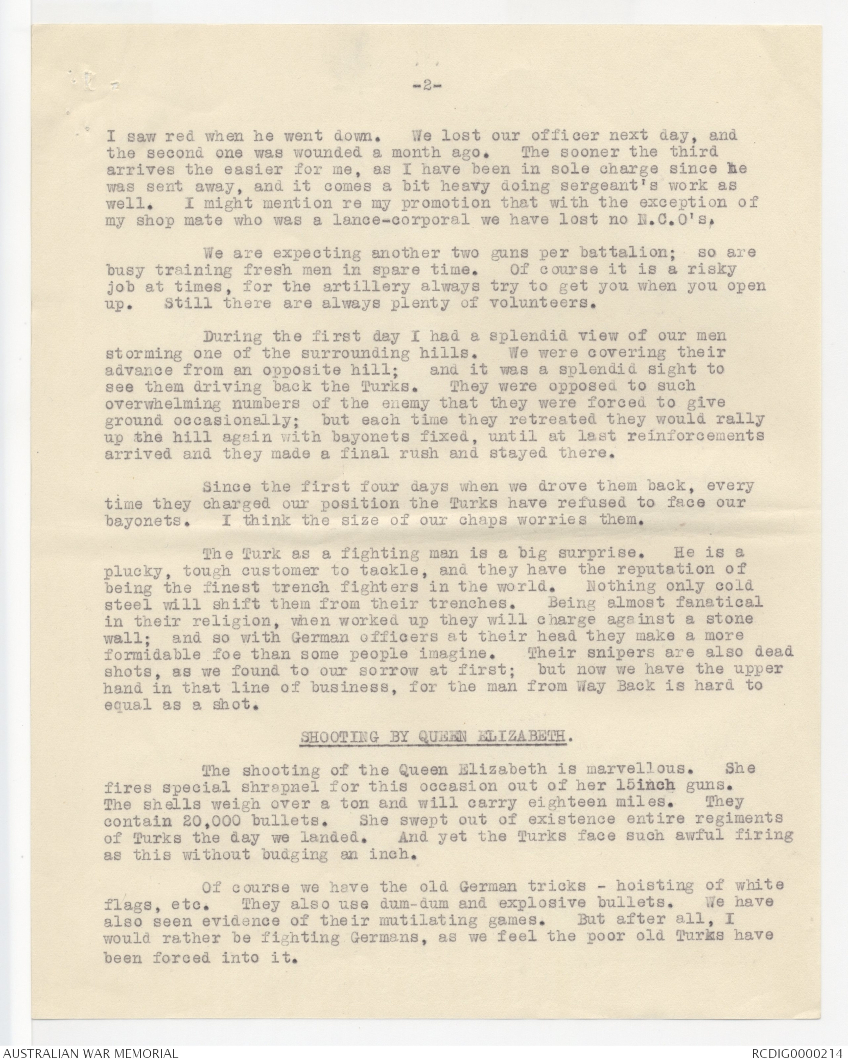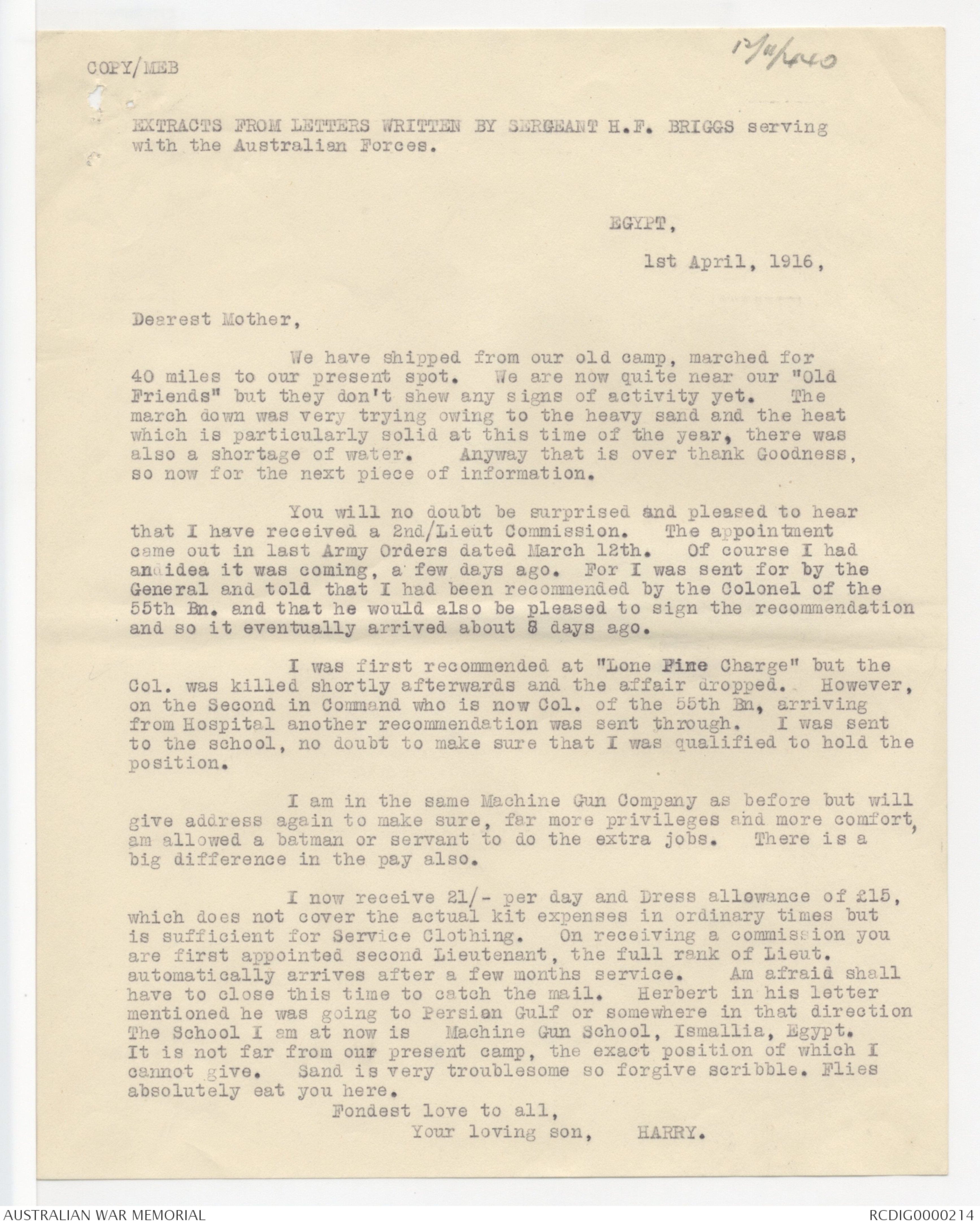 EXTRACT FROM LETTER WRITTEN BY SERGEANT H.F. BRIGGS.