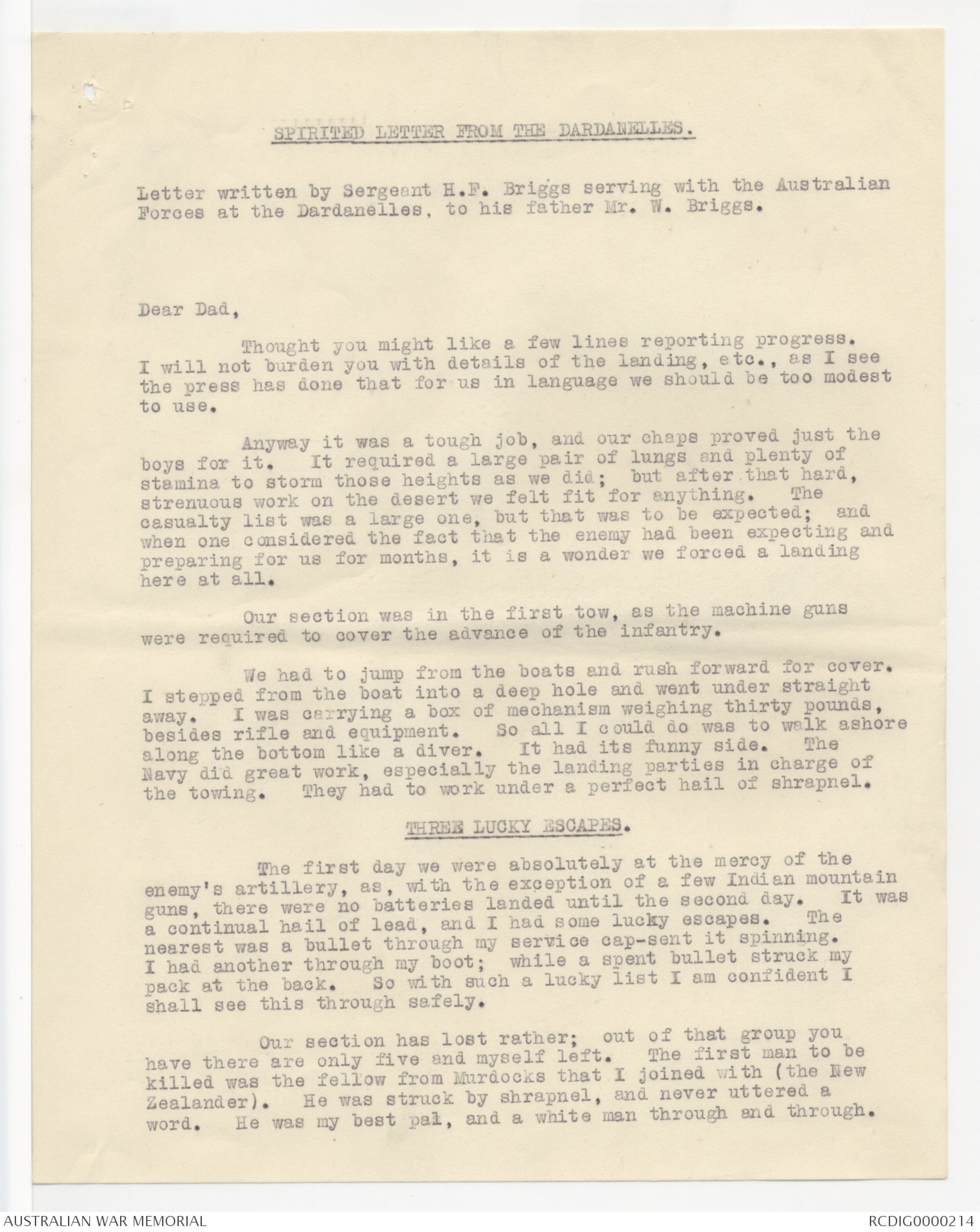 Forces at the Dardanelles, to his father Mr. W. Briggs.