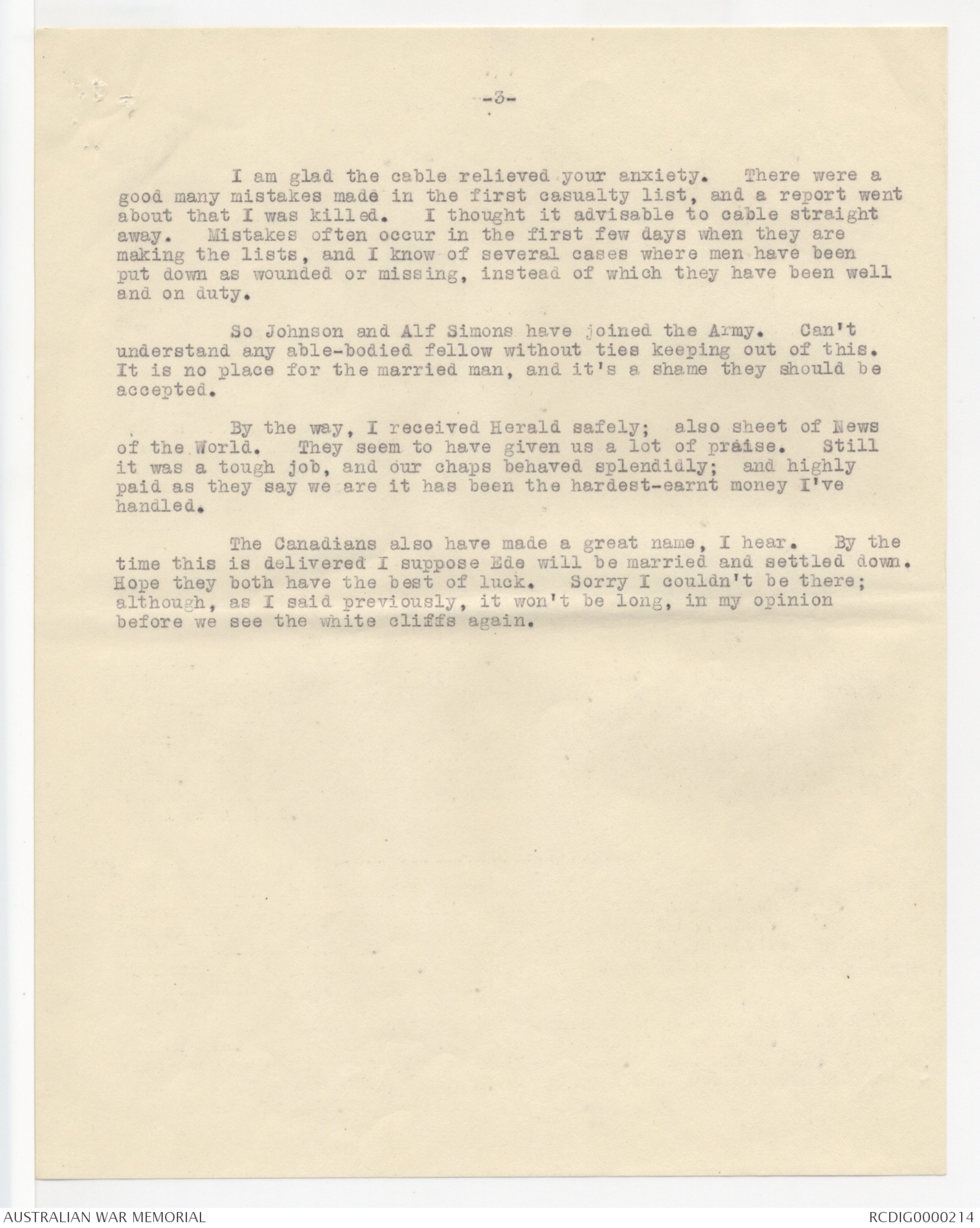 about that I was killed. I thought it advisable to cable straight