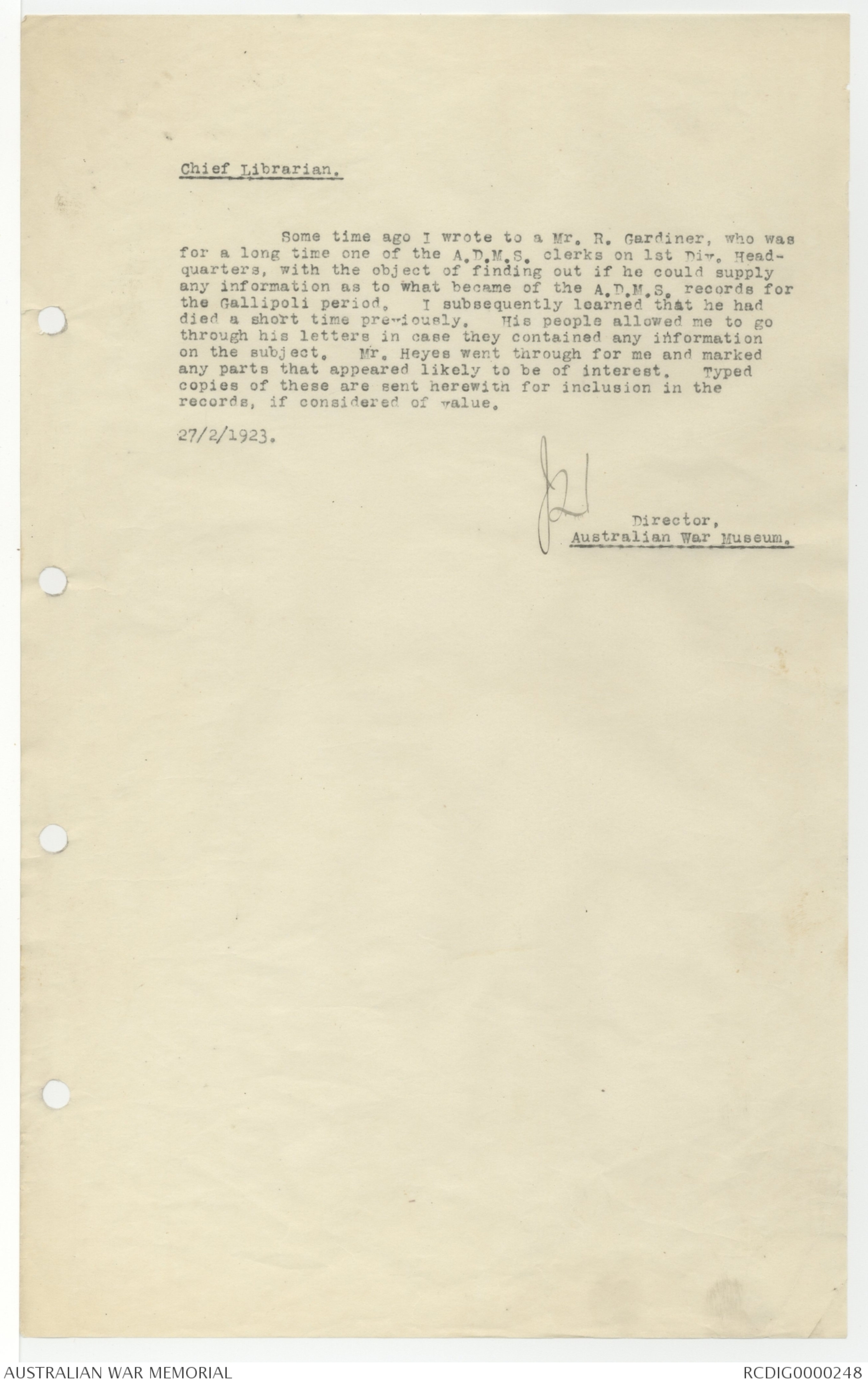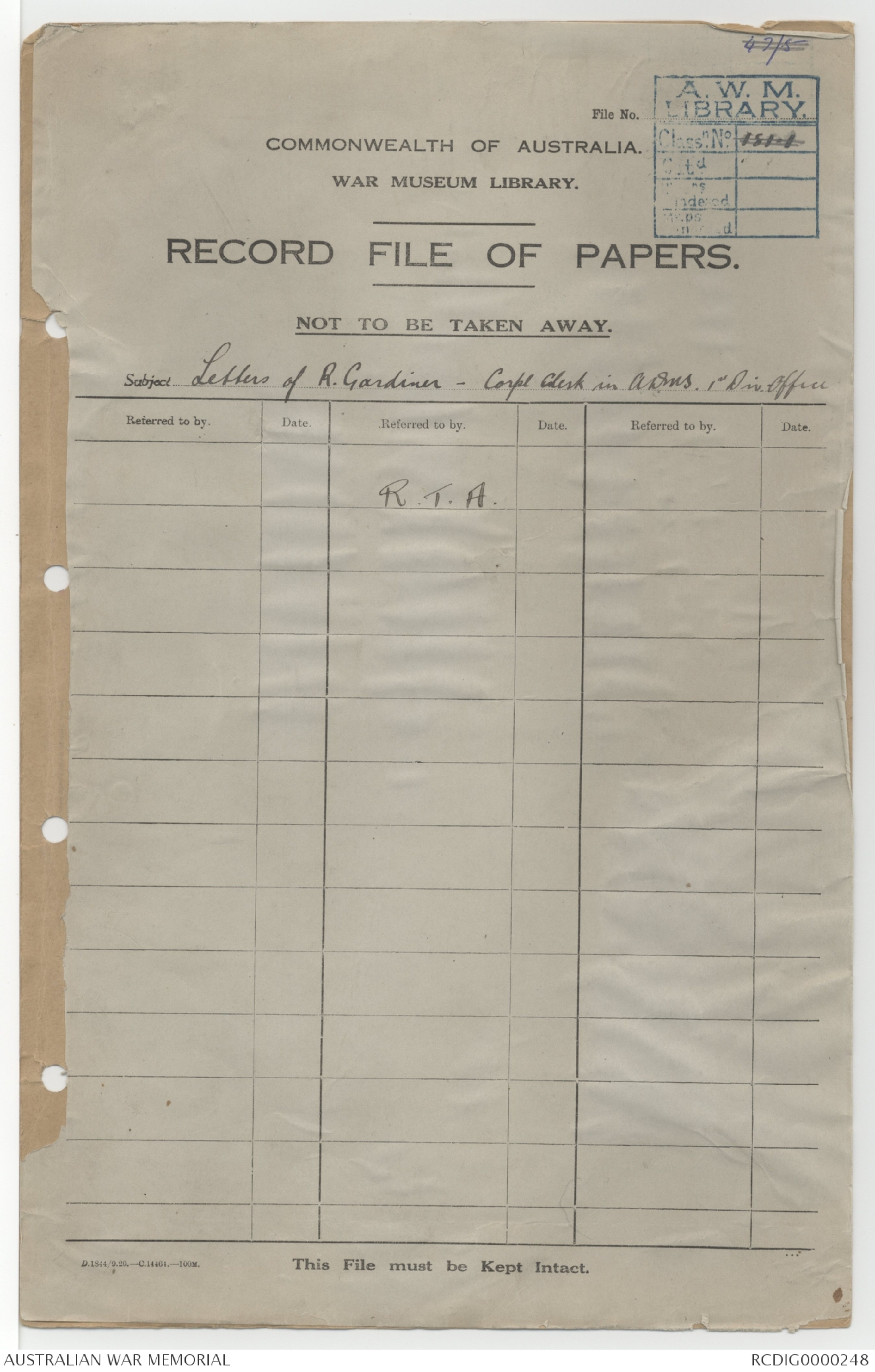 Subject Letters of R. Gardiner - Corpl Clerk in ADMS. 1st Div. Office.