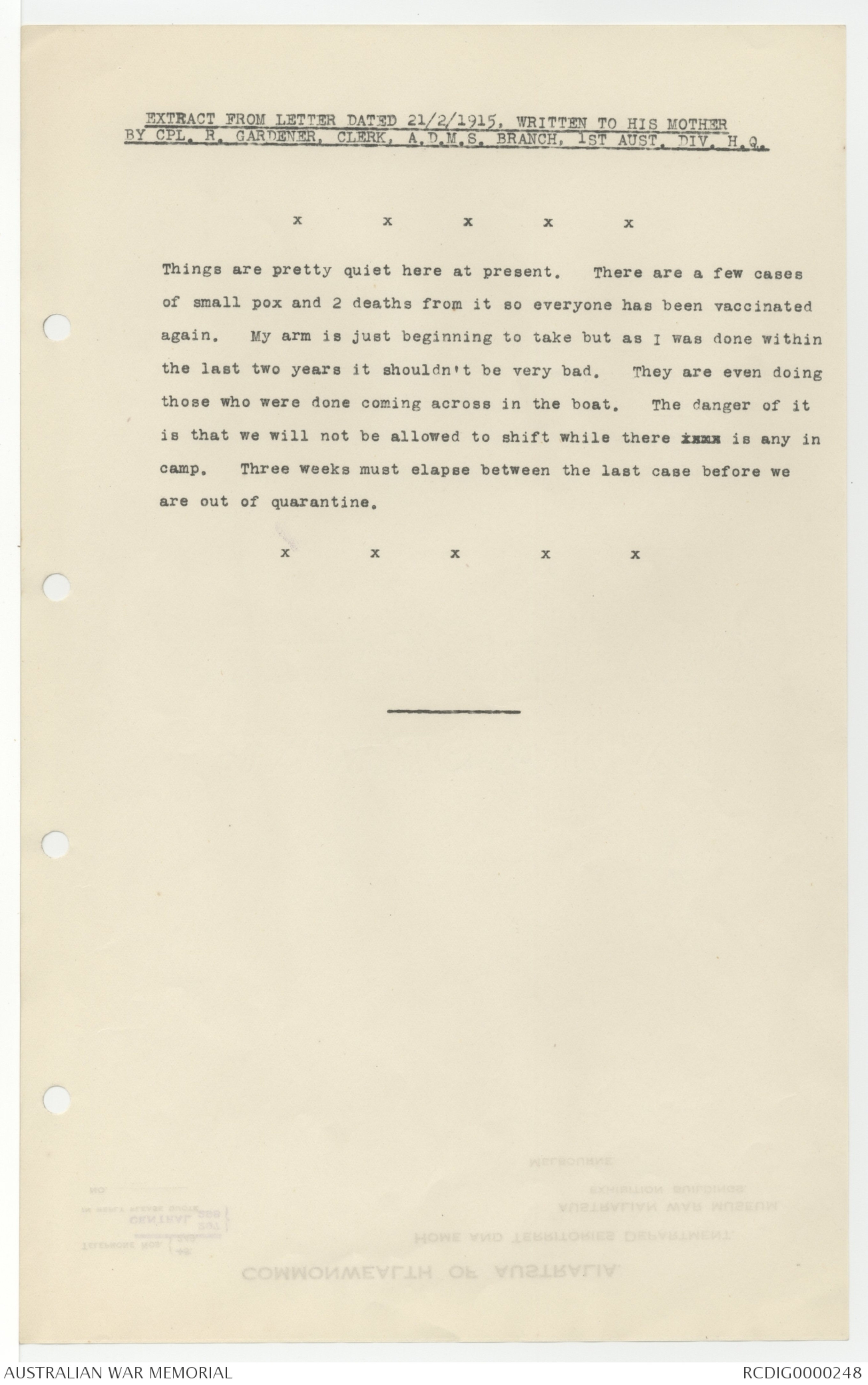 EXTRACT FROM LETTER DATED 21/2/1915, WRITTEN TO HIS MOTHER