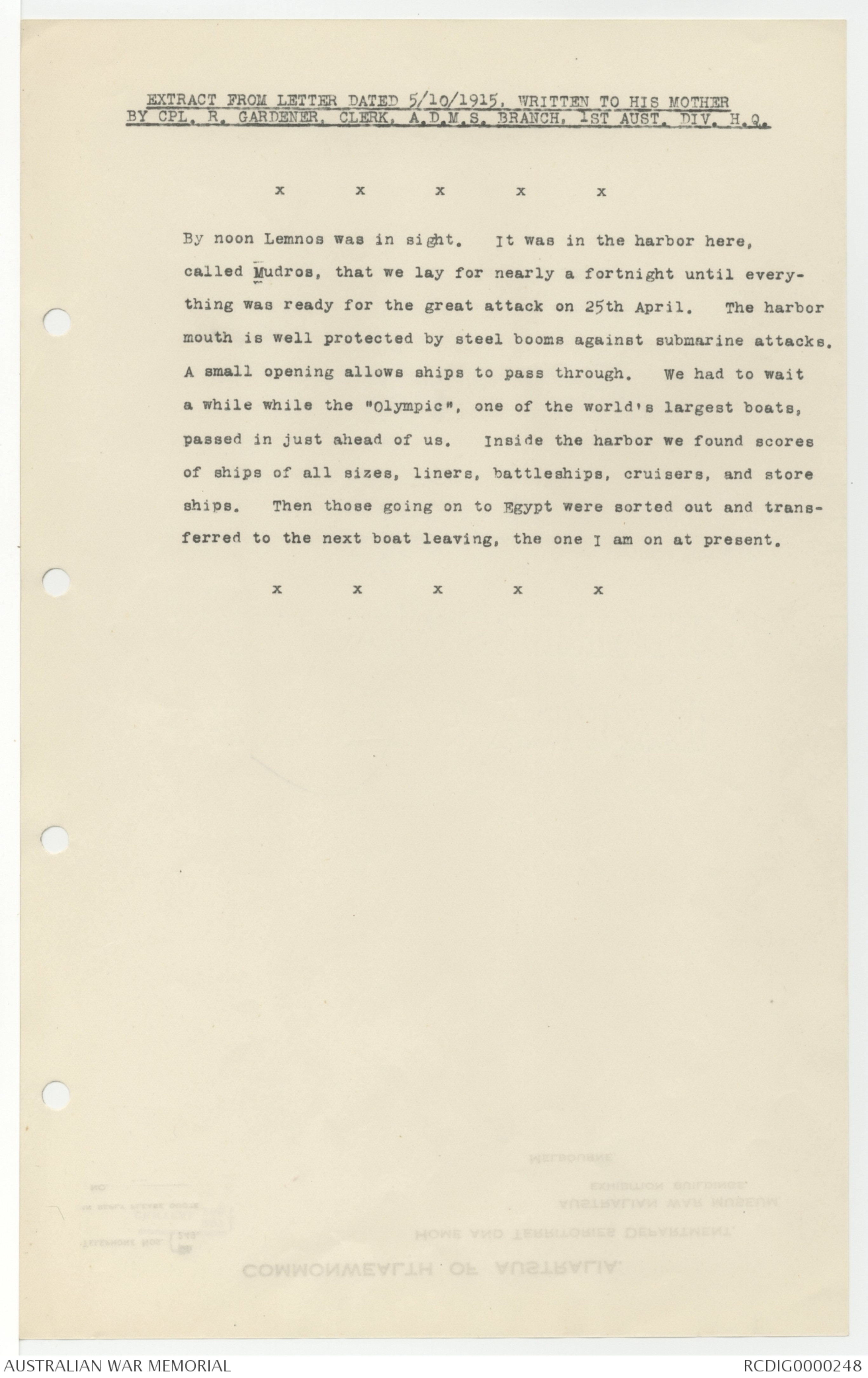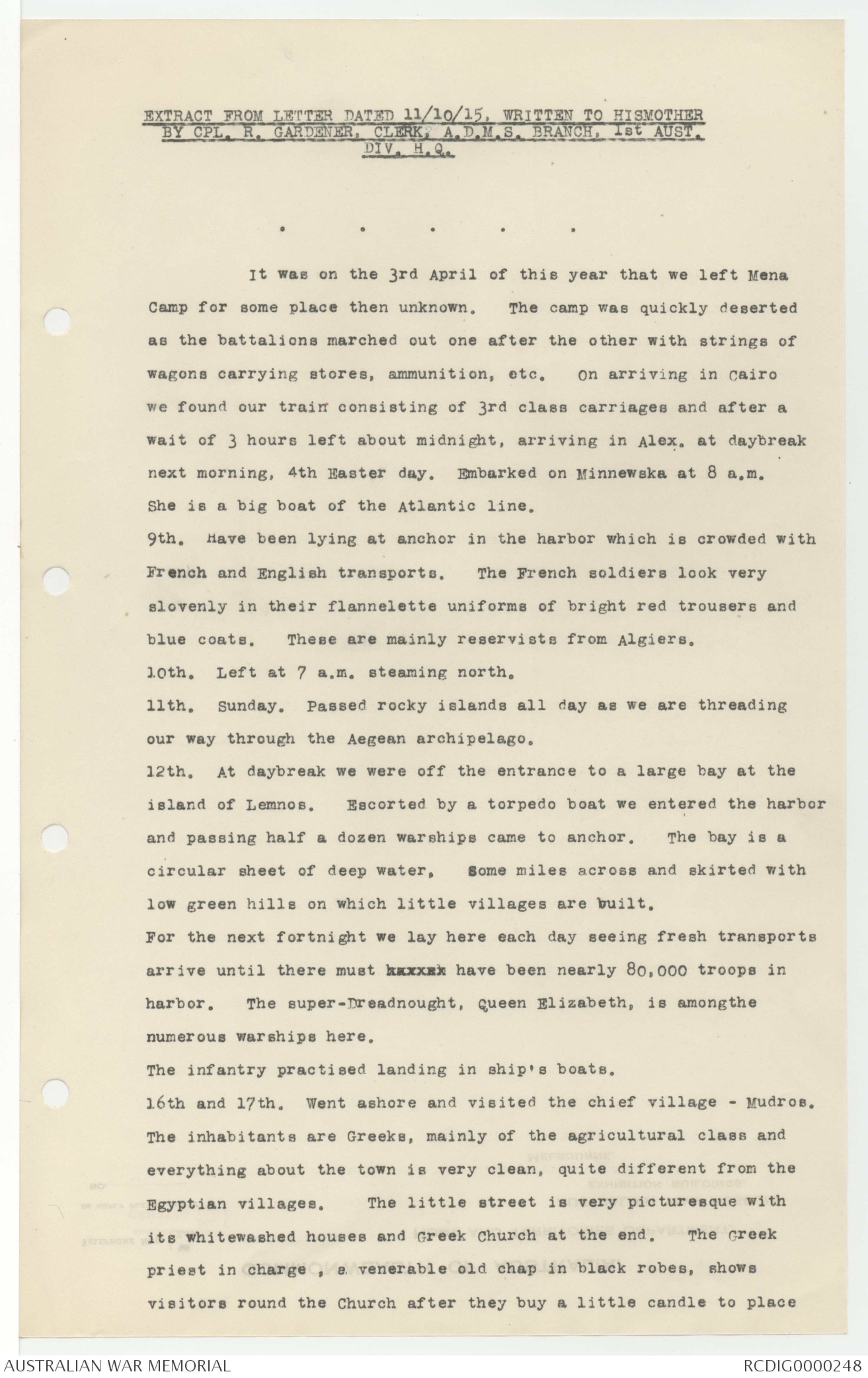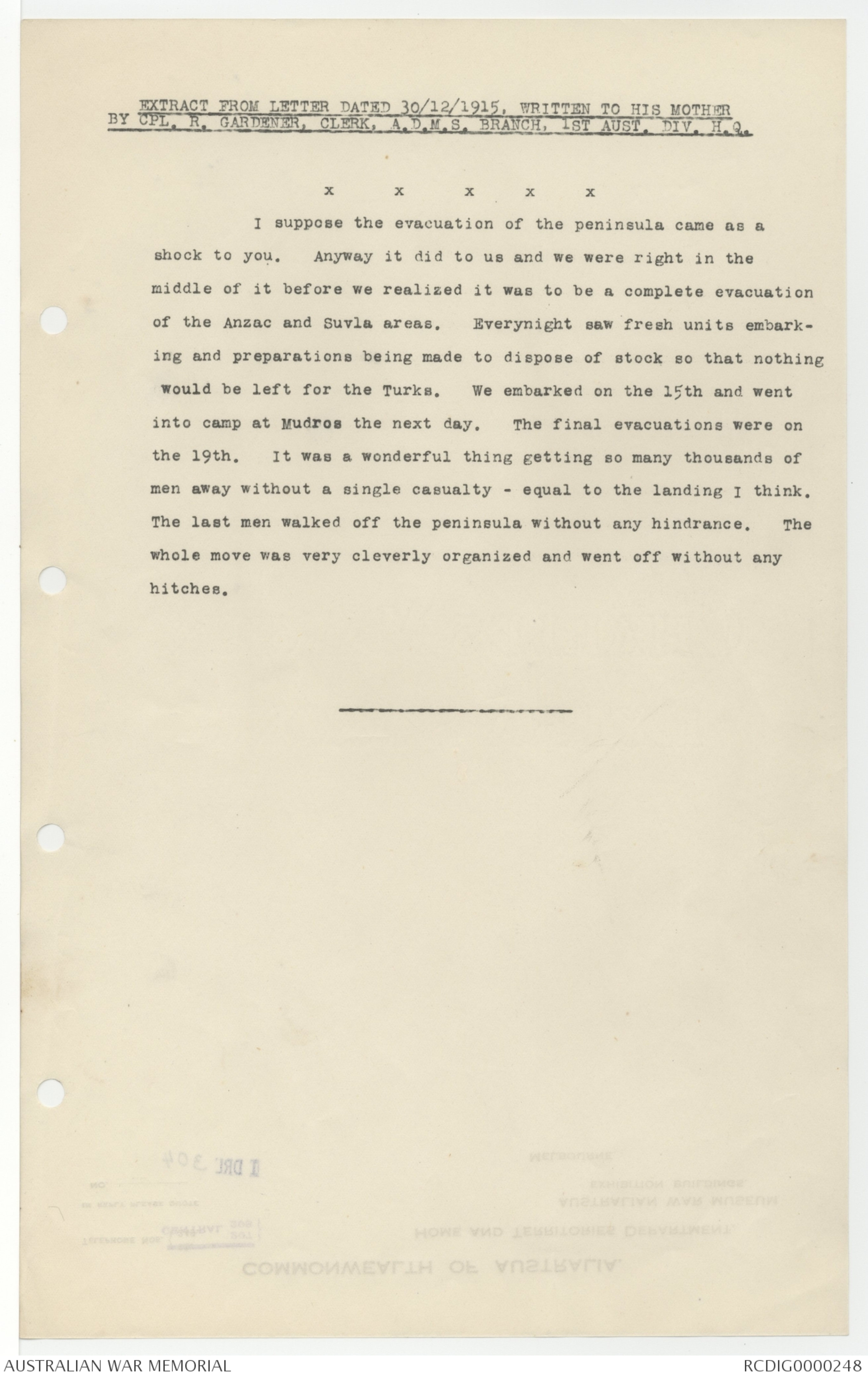 EXTRACT FROM LETTER DATED 30/12/1915, WRITTEN TO HIS MOTHER