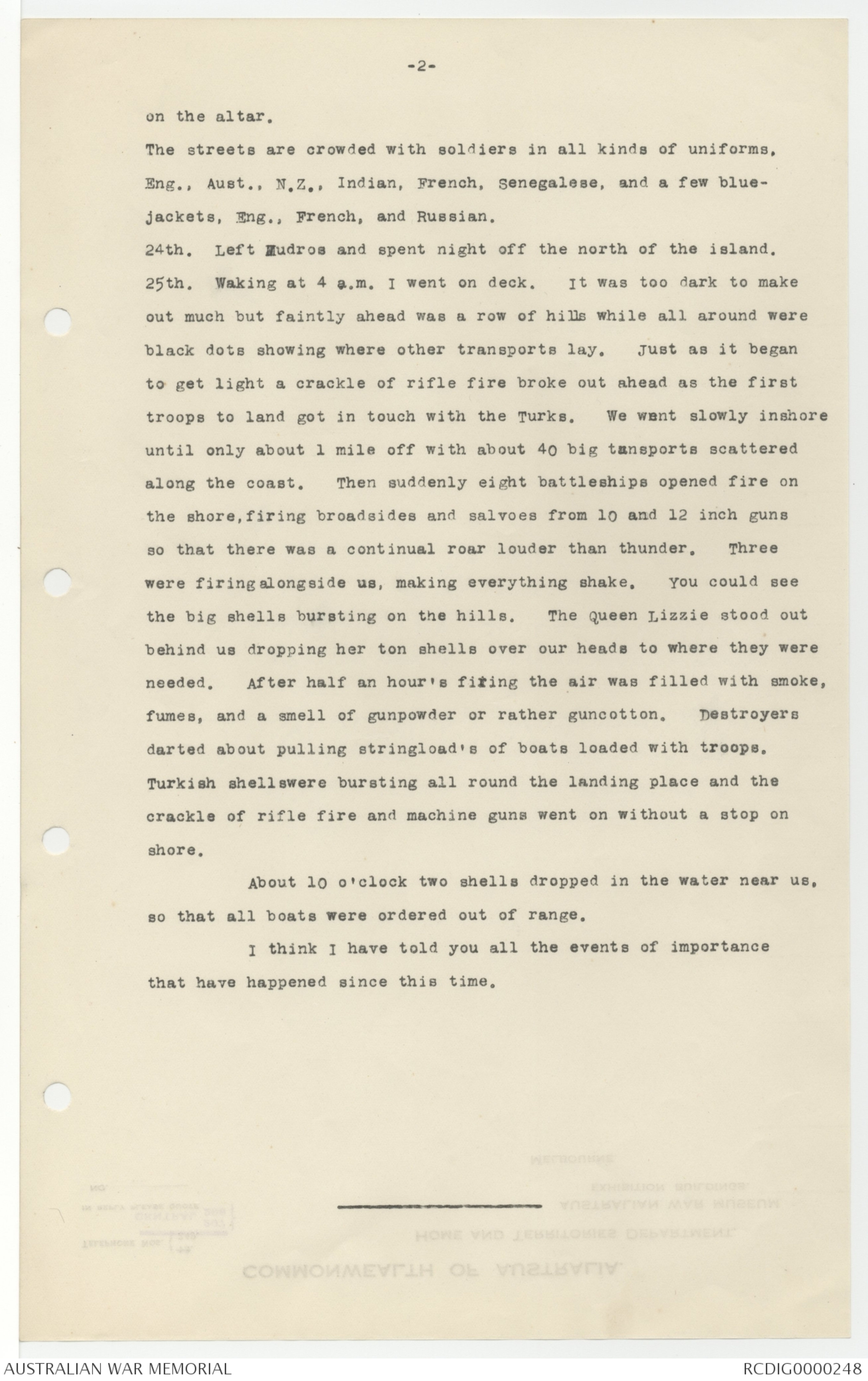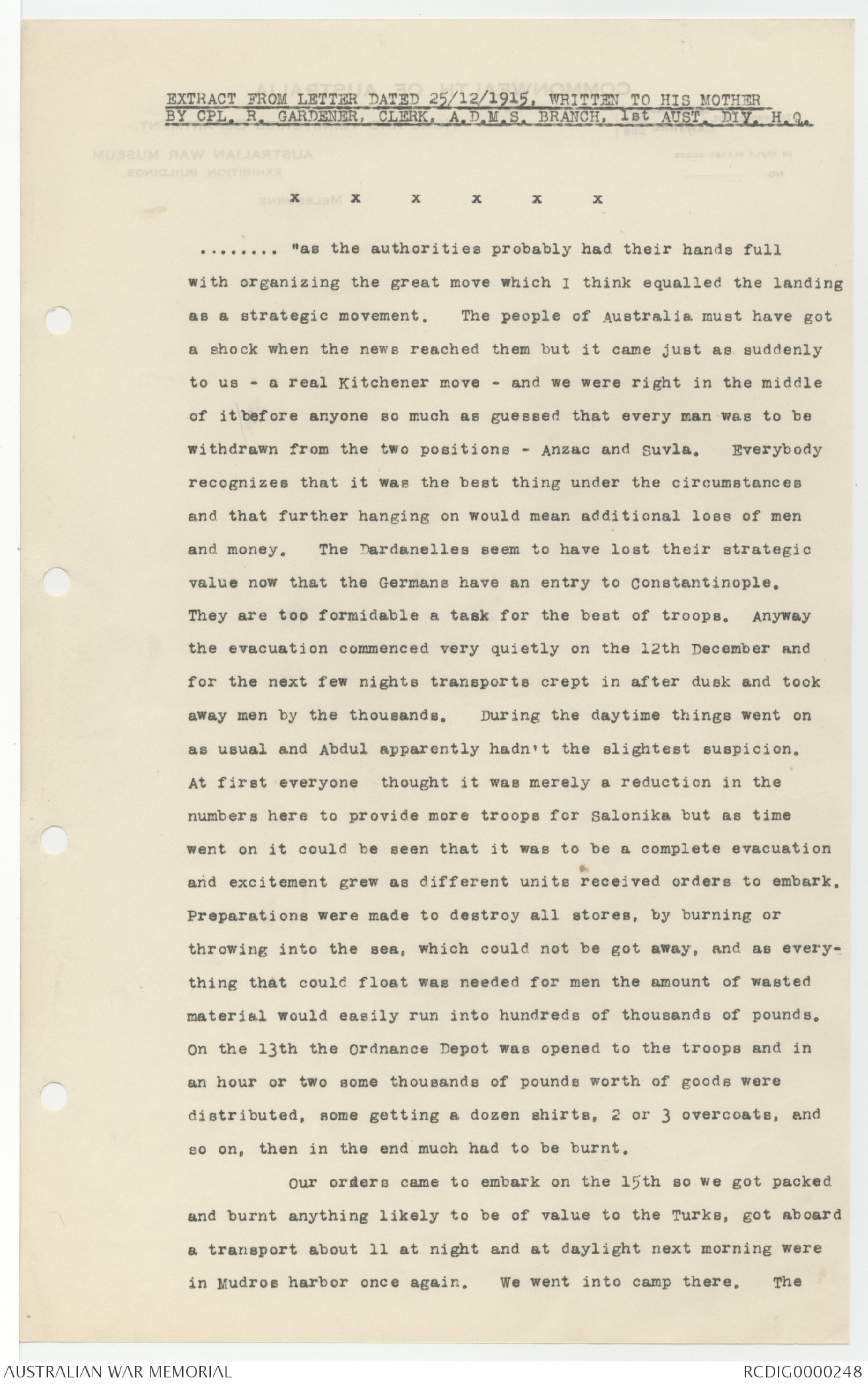 EXTRACT FROM LETTER DATED 25/12/1915, WRITTEN TO HIS MOTHER