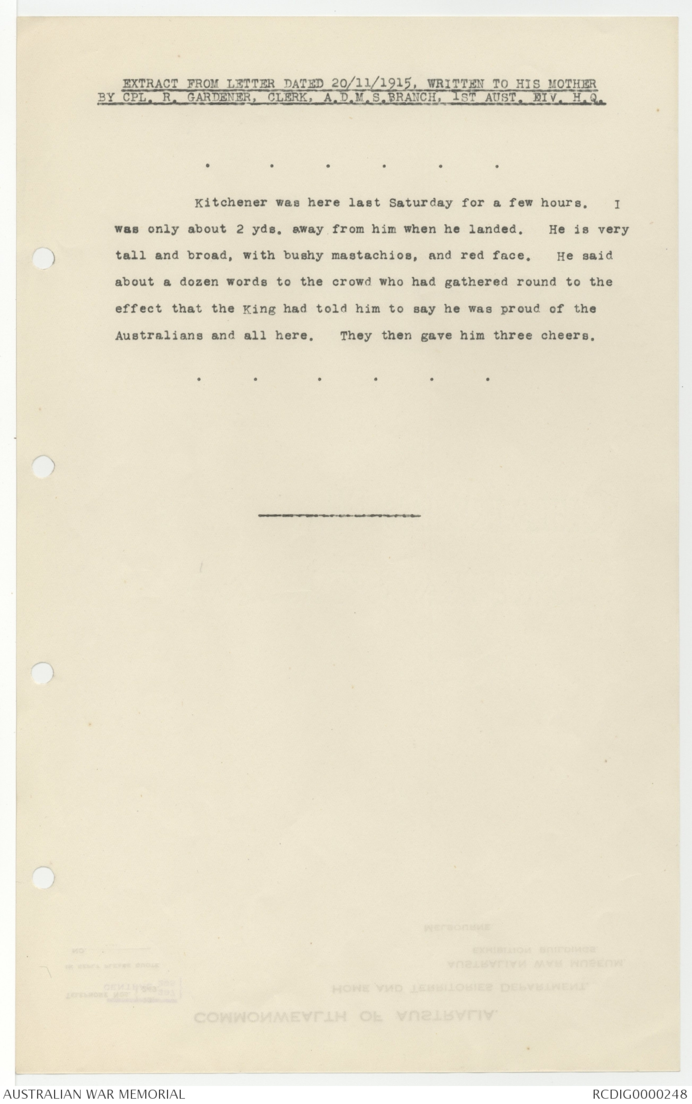 EXTRACT FROM LETTER DATED 20/11/1915, WRITTEN TO HIS MOTHER