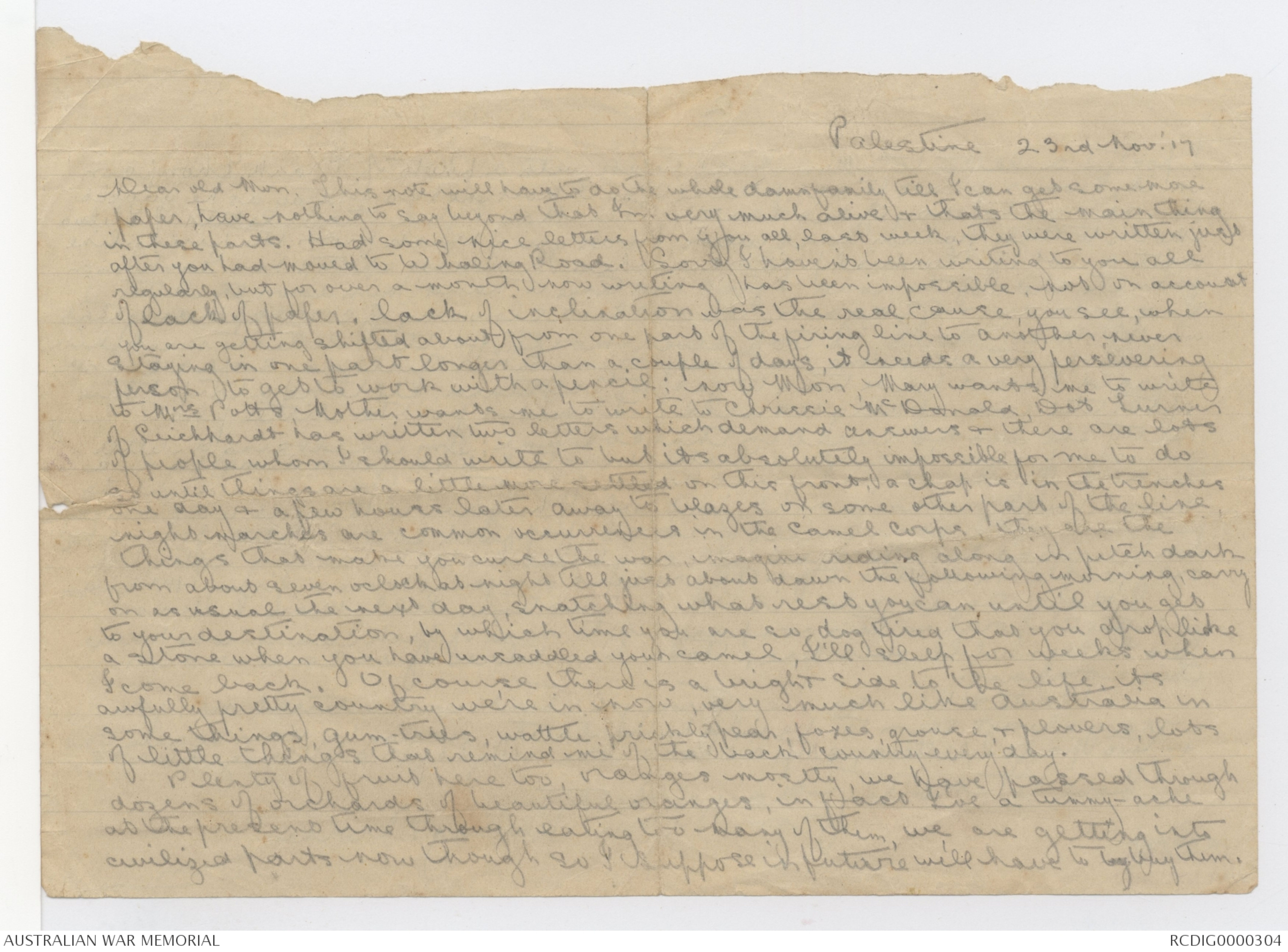 Letter from Donald Law Patrick Cameron to his Family, 1917