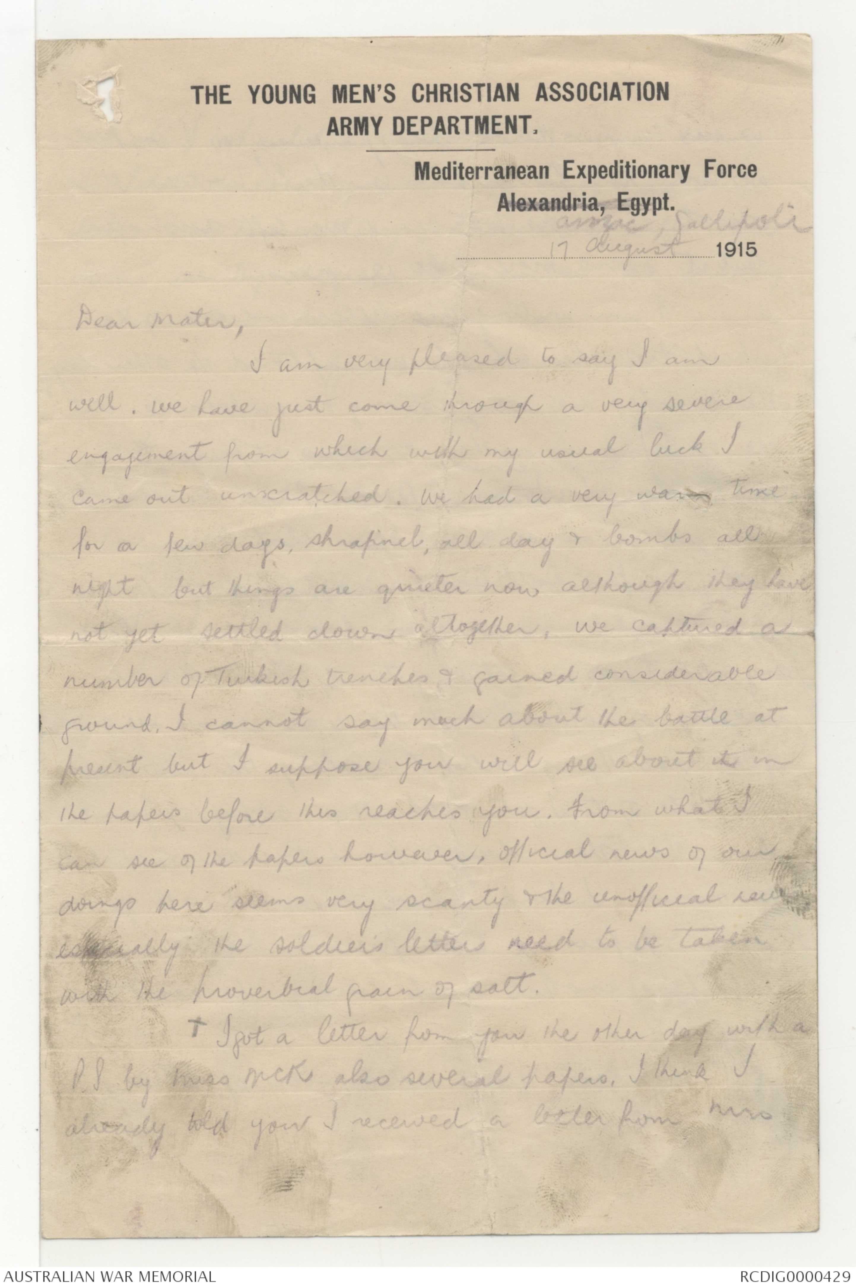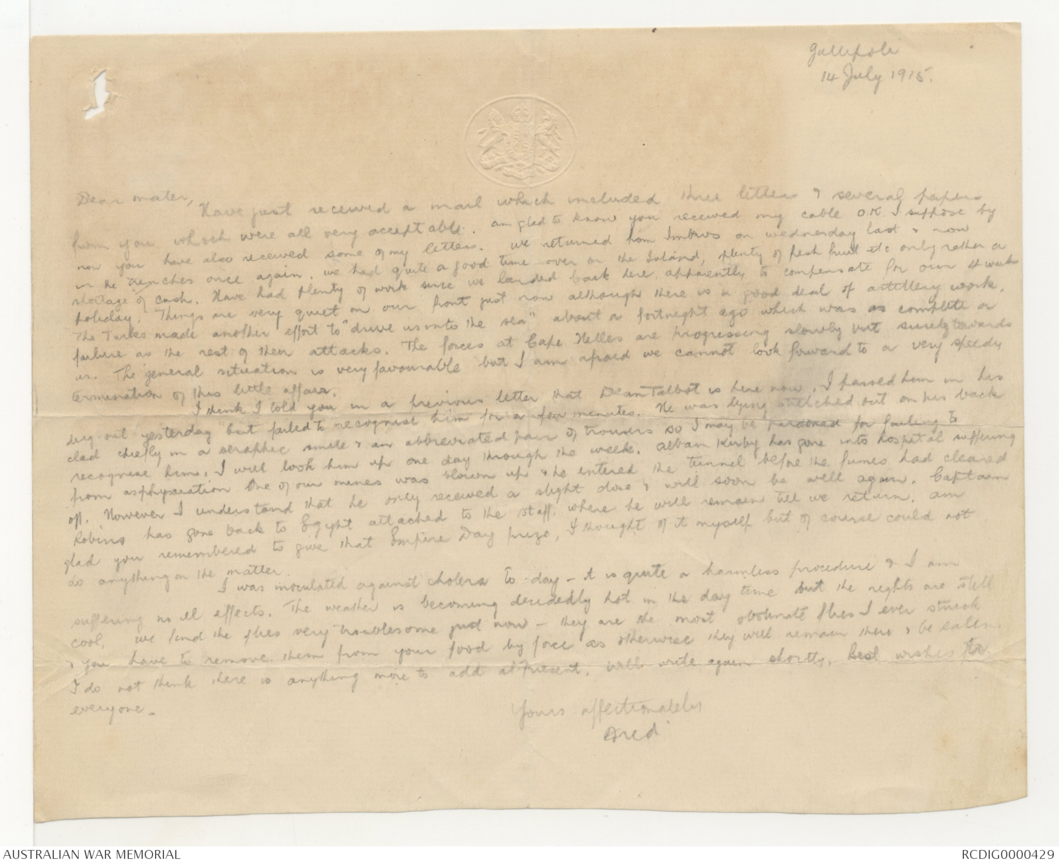 now you have also received some of my letters. We returned from Imbros on Wednesday last & now