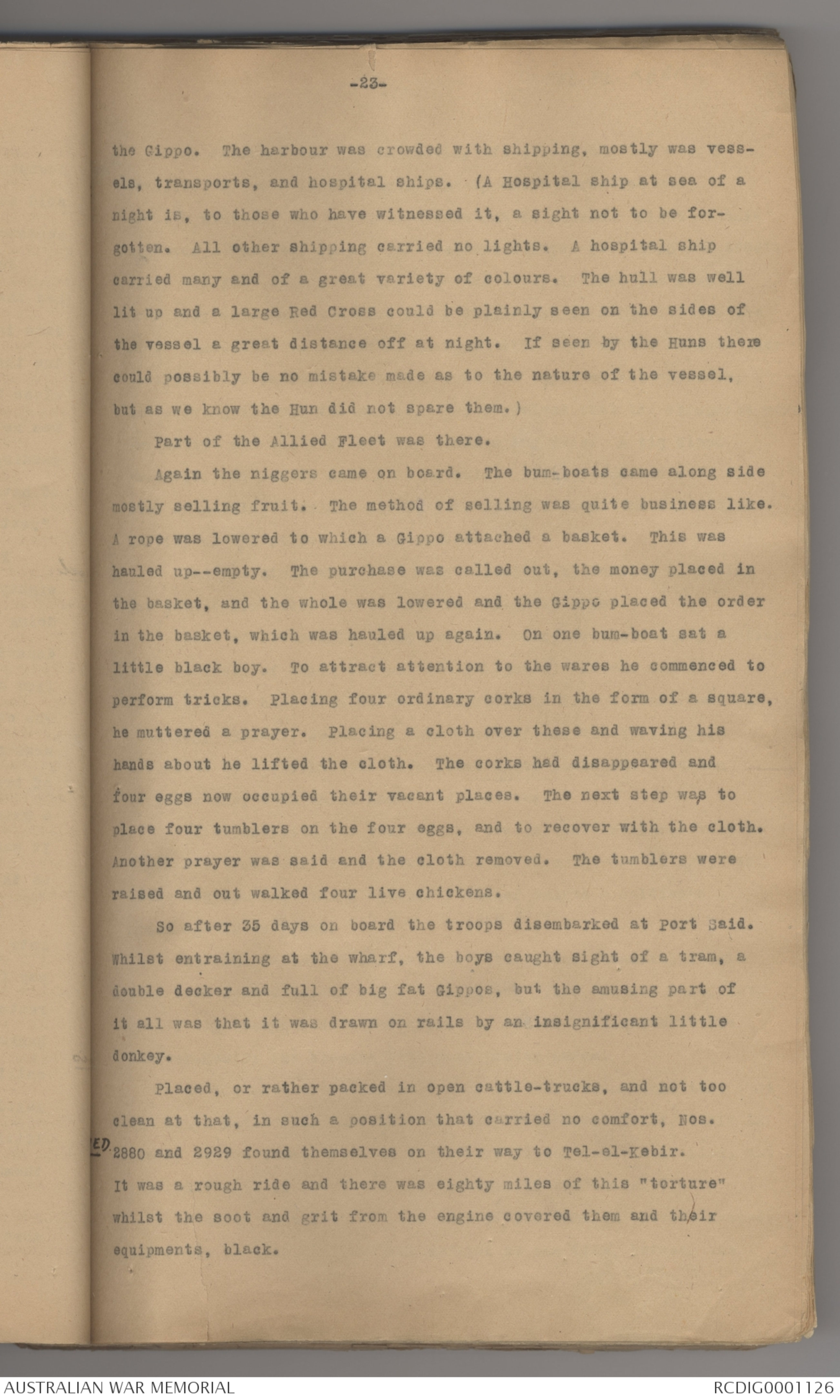 the Gippo. The harbour was crowded with shipping, mostly was vessels, transports, and hospital ships. (A Hospital ship at sea of a