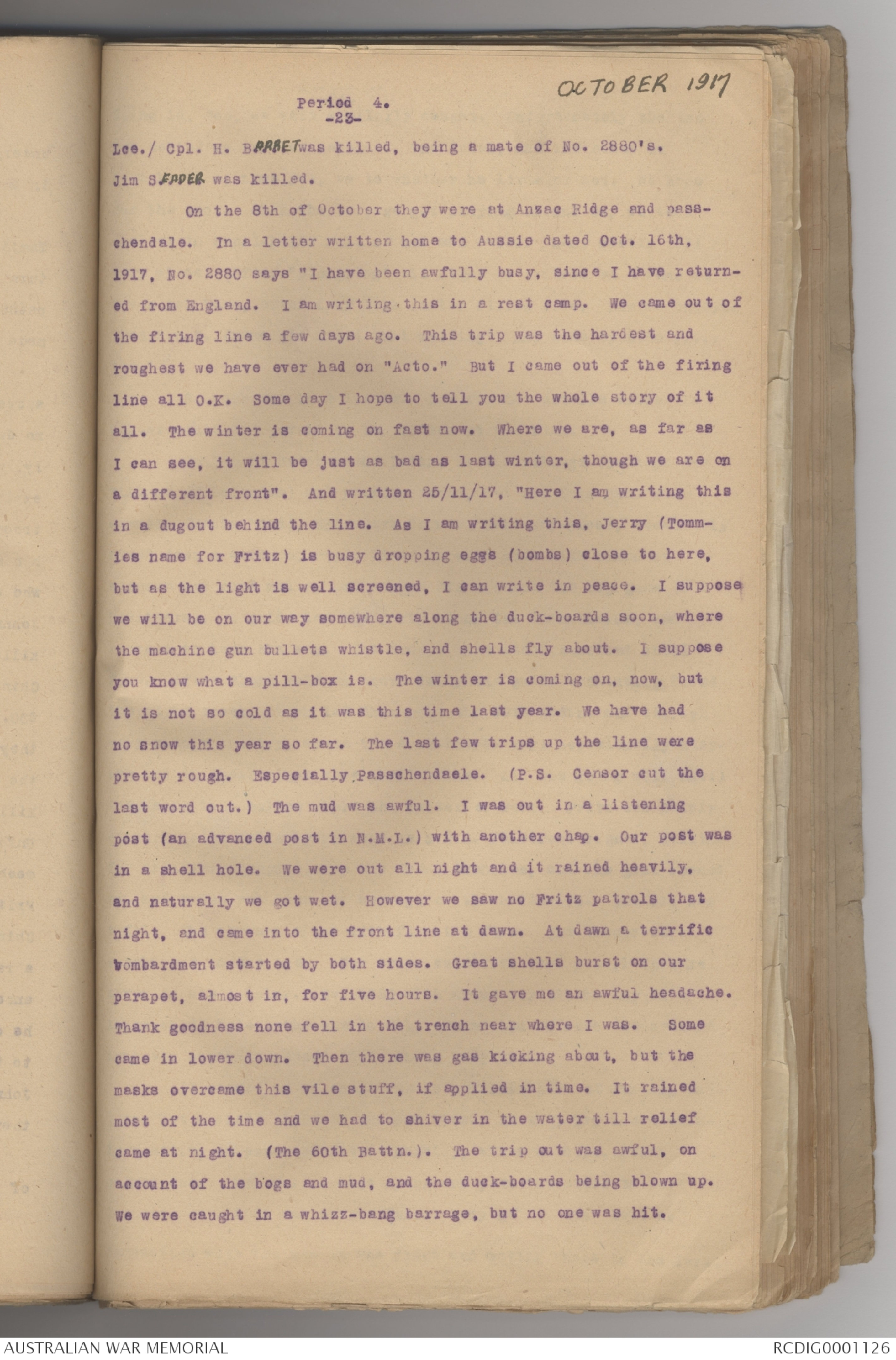 Lce./ Cpl. H. BARRET was killed, being a mate of No. 2880's.
