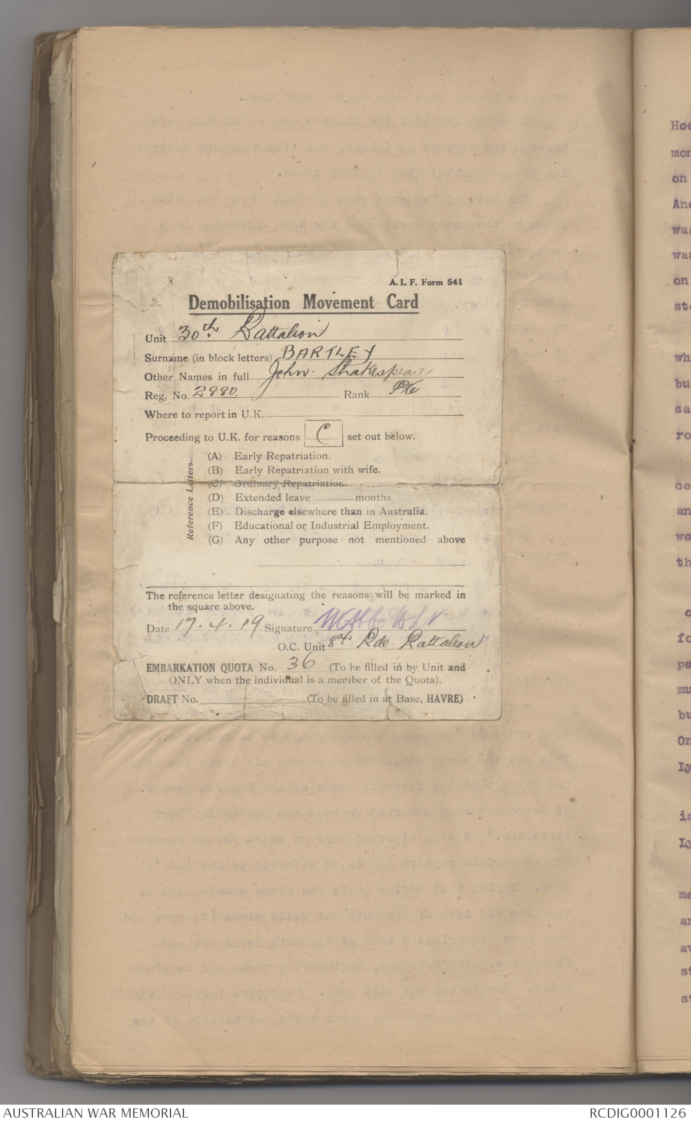 EMBARKATION QUOTA No. 36 (To be filled in by Unit and
