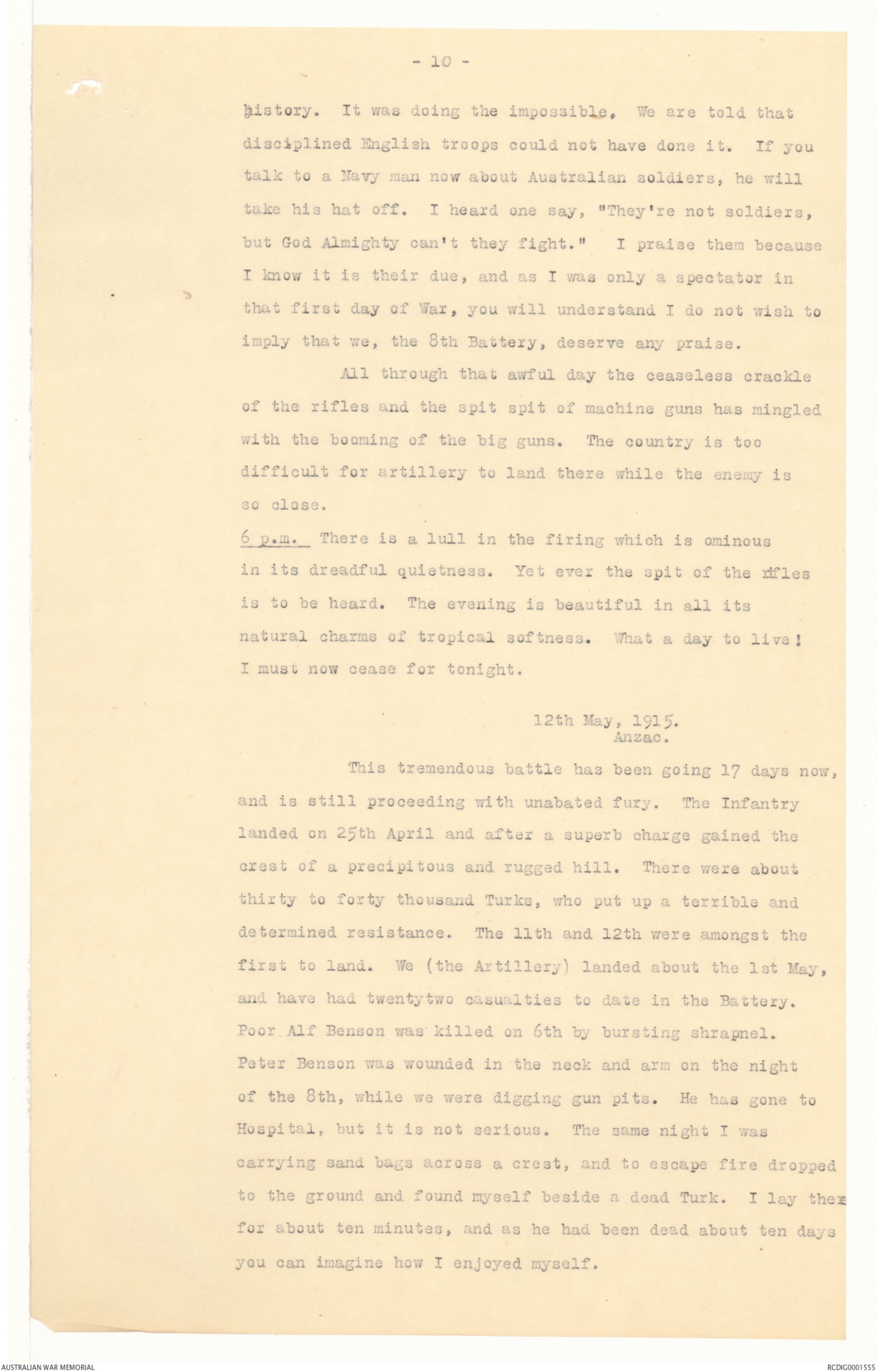 Poor Alf Benson was killed on 6th by bursting shrapnel.