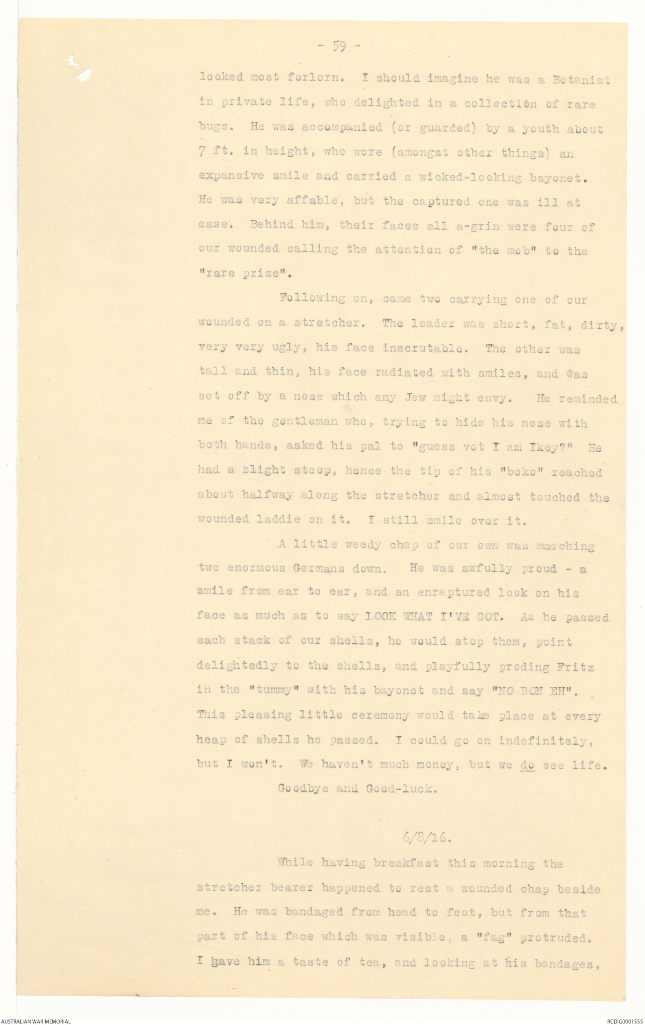 in the "tummy" with his bayonet and say "NO BON EH".