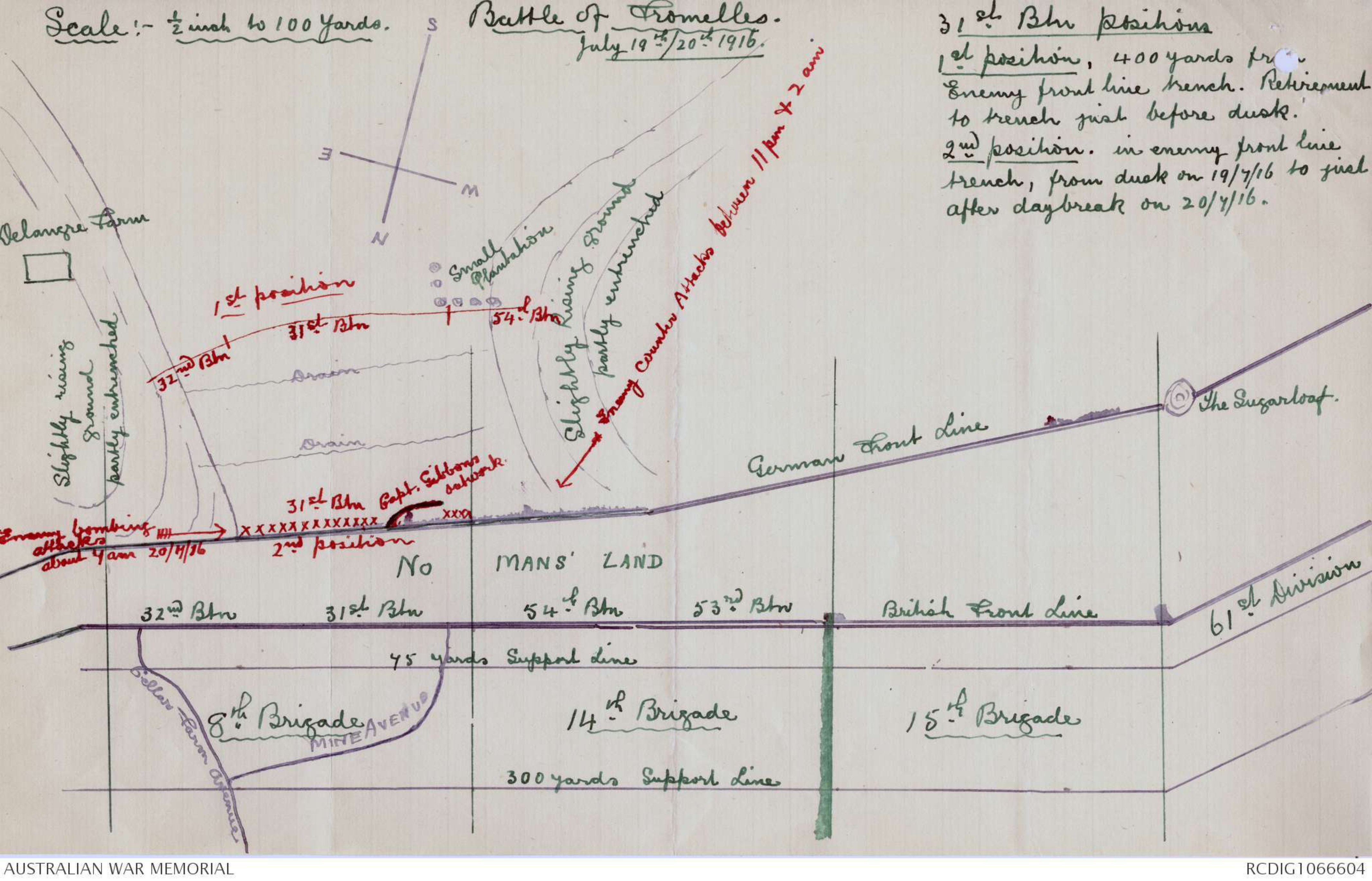 8th Bgde disposition:- 31st Btn right sector, 32nd Btn left sector,